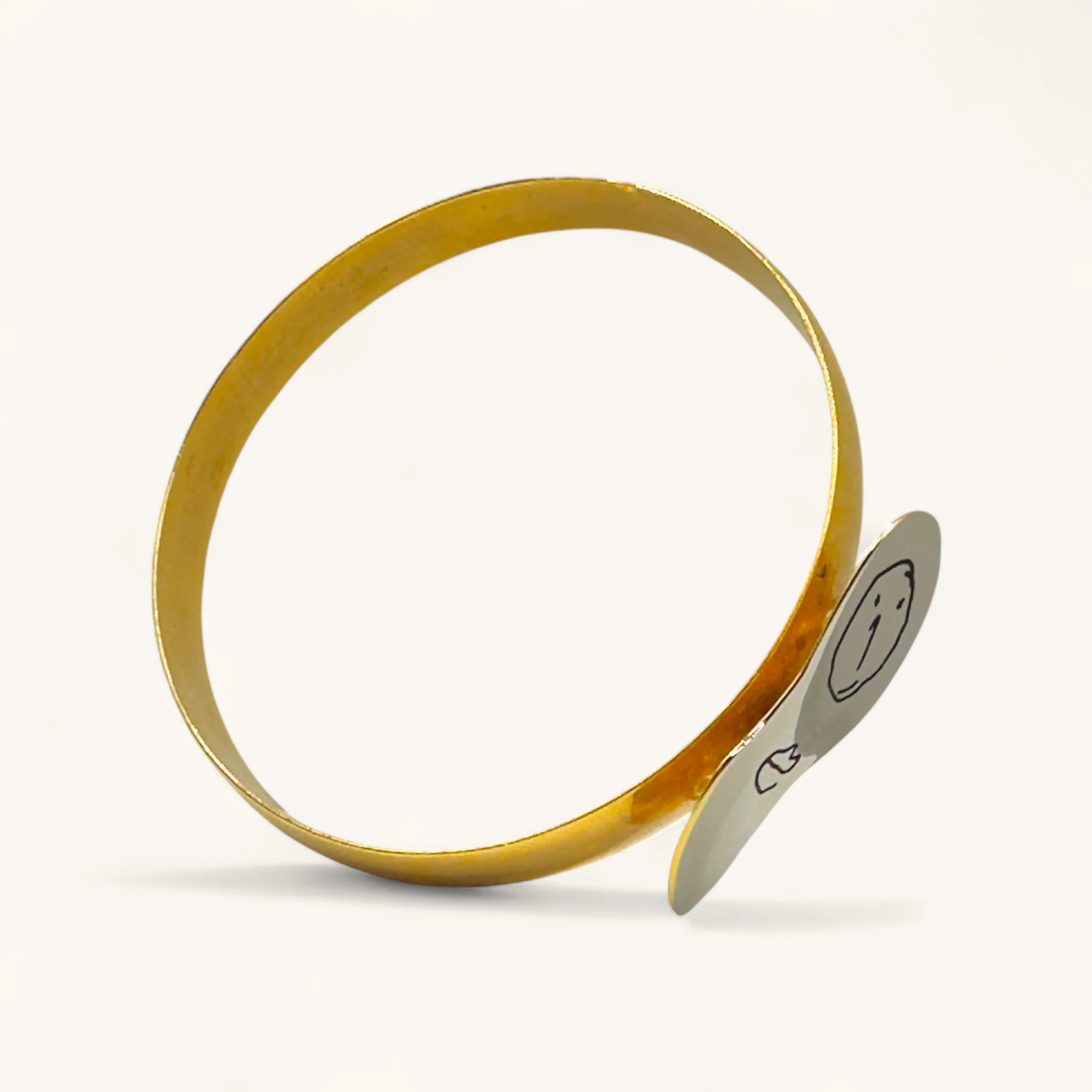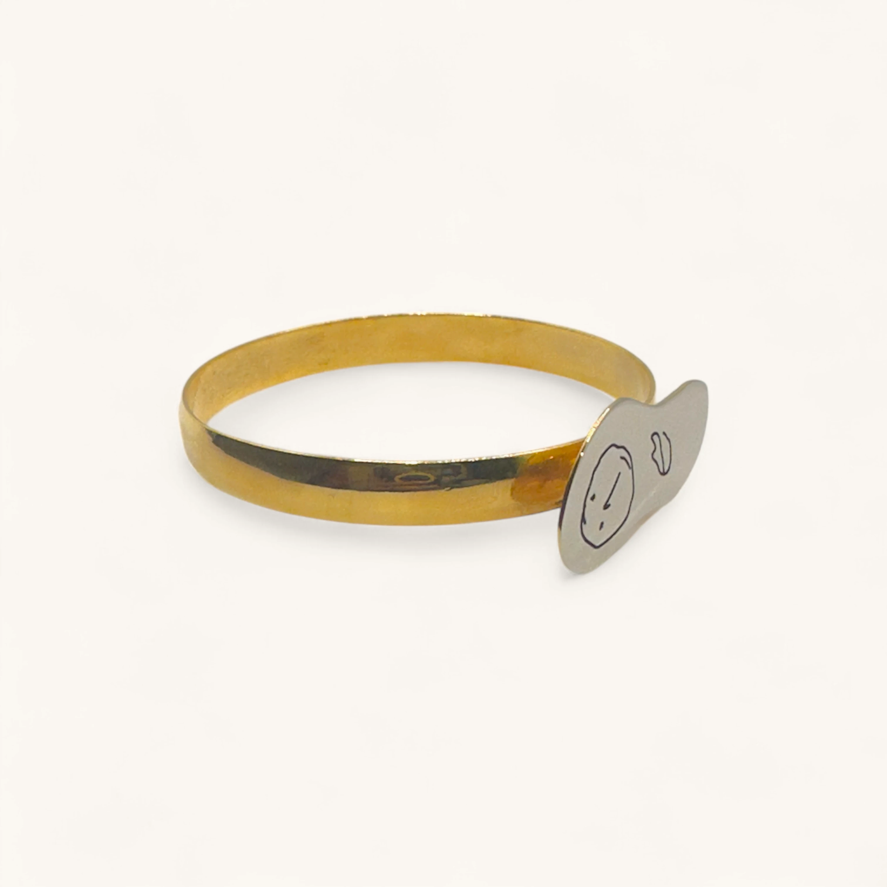 A modern and artistic bracelet featuring a slim gold band with an abstract face design at its center. The face motif, etched in minimalist lines, adds a playful yet contemporary touch, making this piece stand out as wearable art. Lightweight and stylish, it’s the perfect accessory for those who appreciate creativity and unique jewelry designs.
