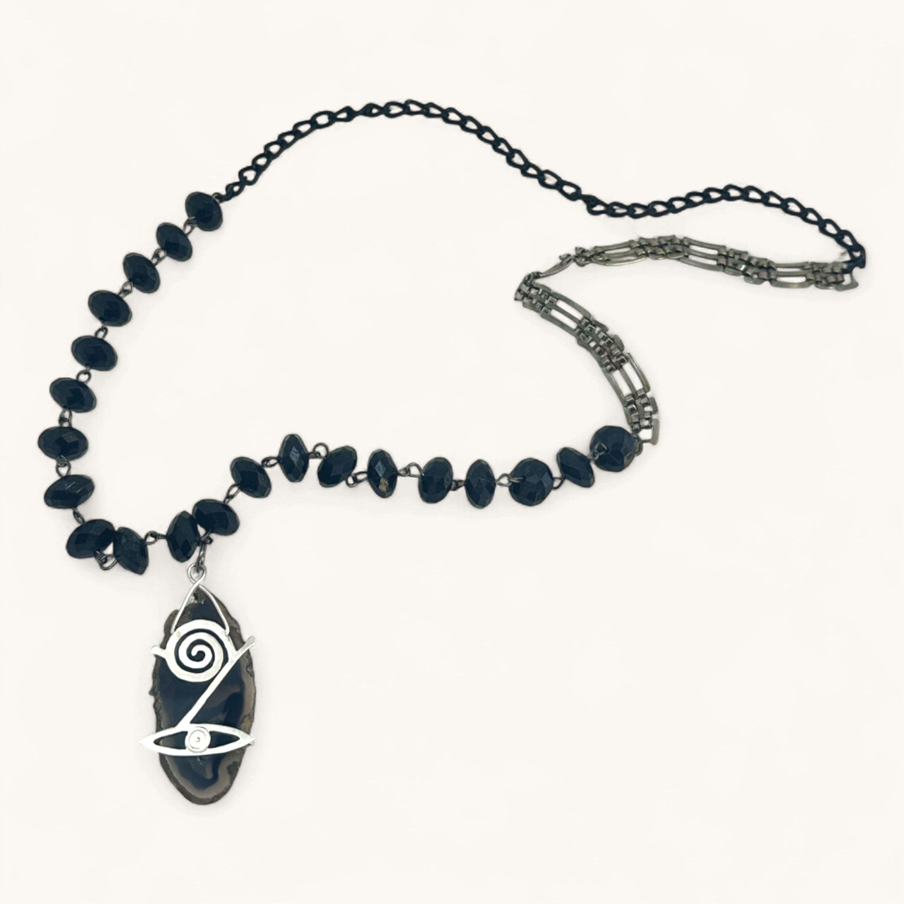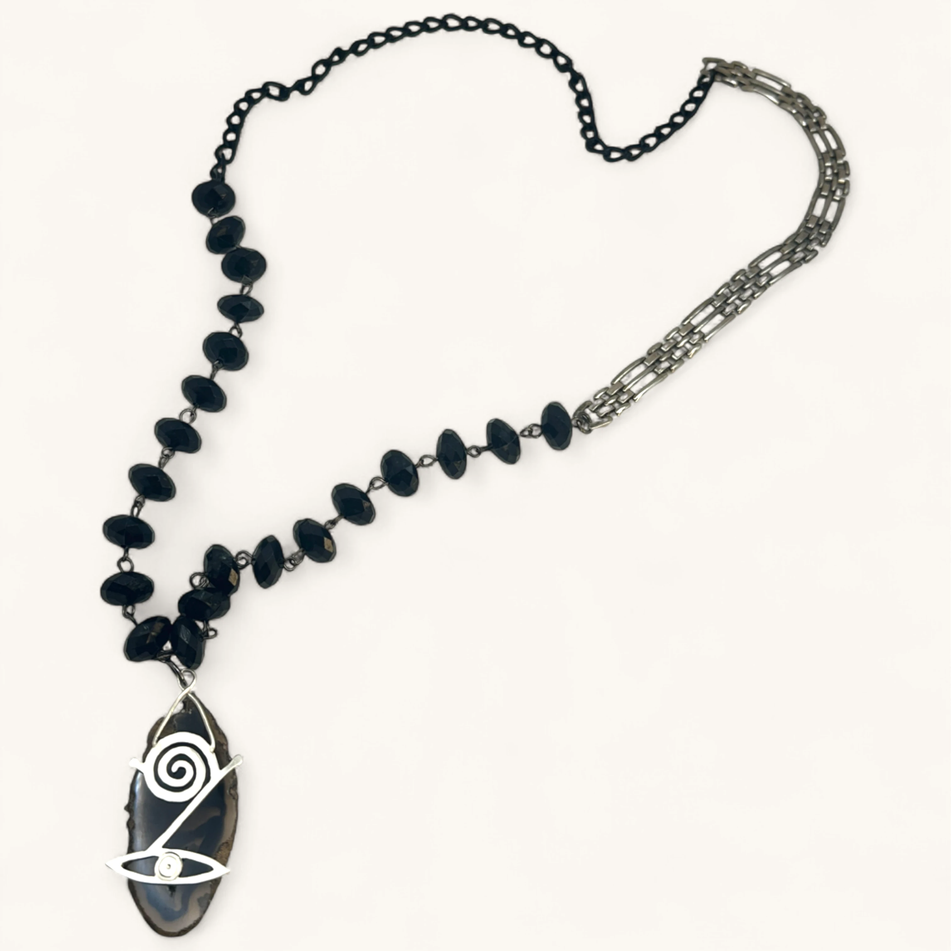 A strand of faceted black beads showcases a brown agate slice overlaid with a silver spiral and eye emblem—mystical and modern.