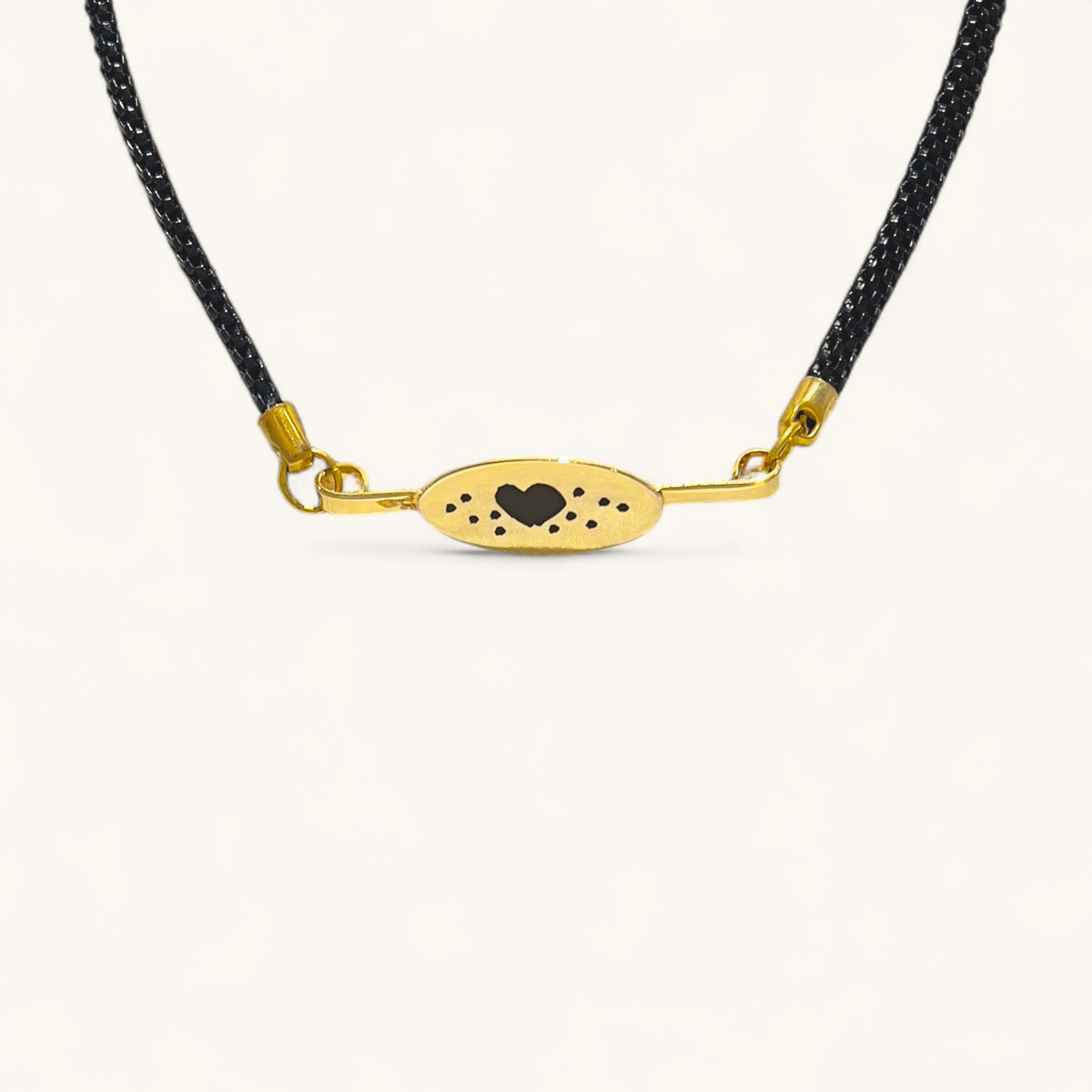 Slim black cord with a golden oval plate engraved with a heart motif.