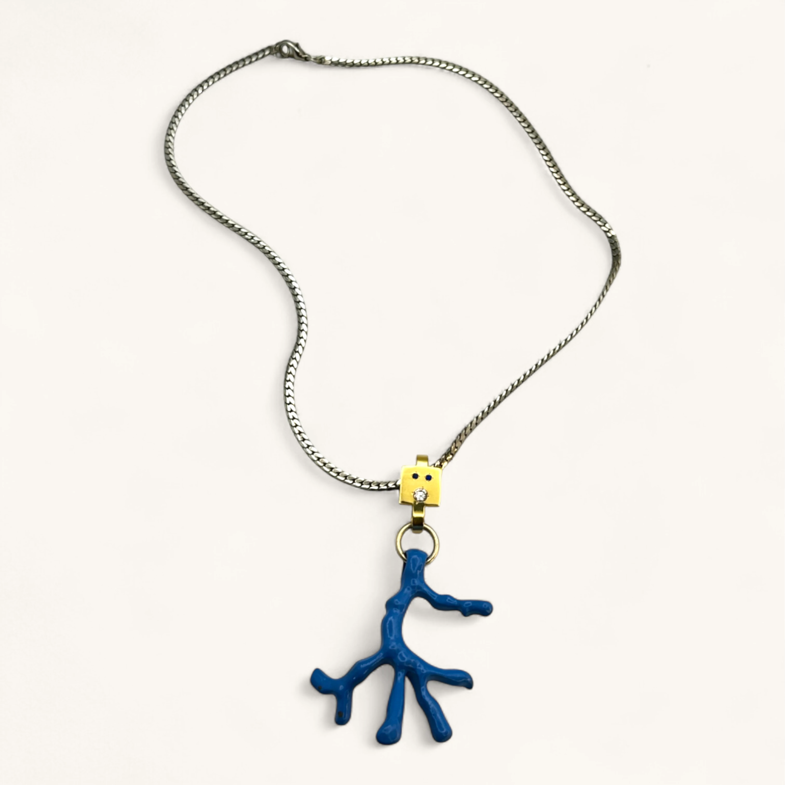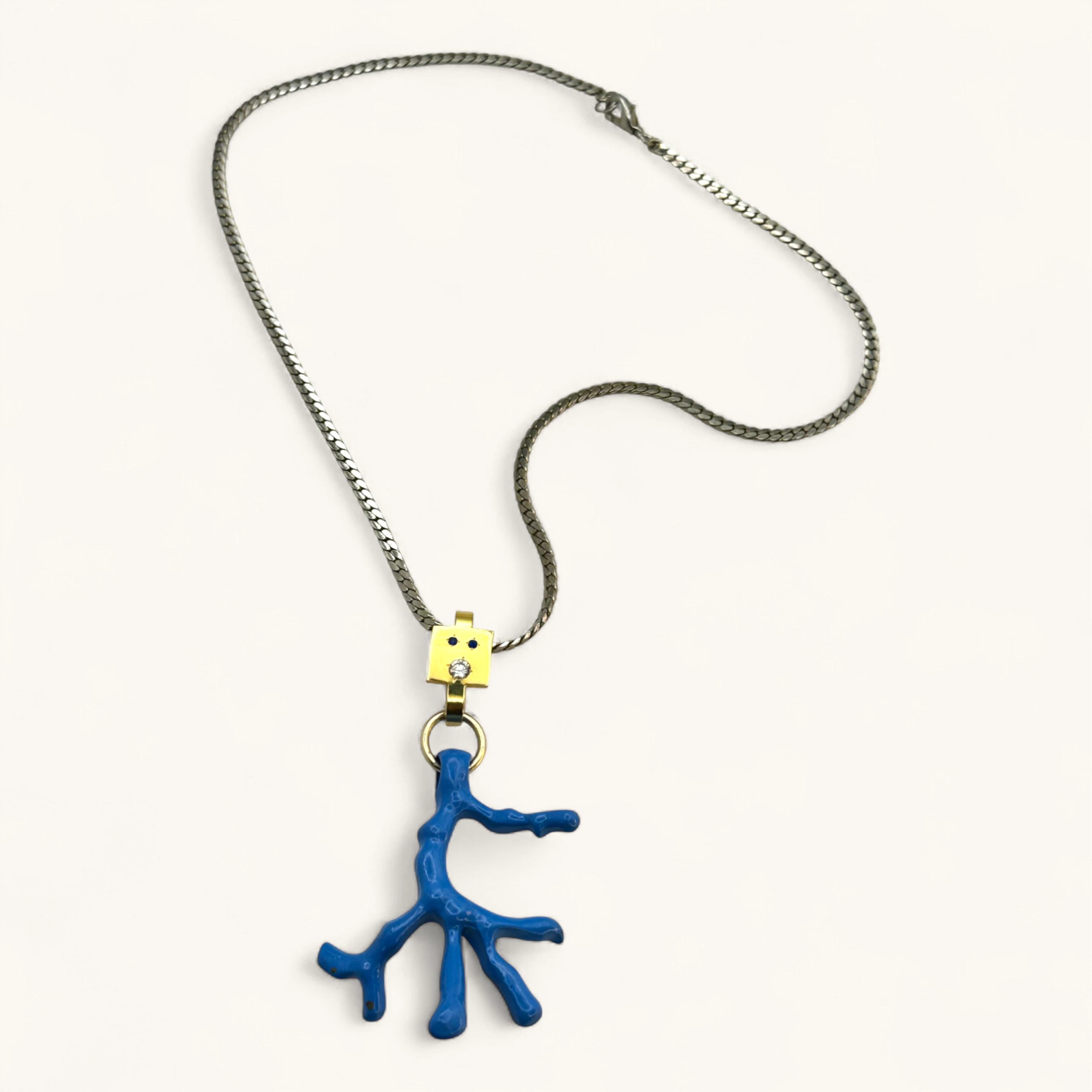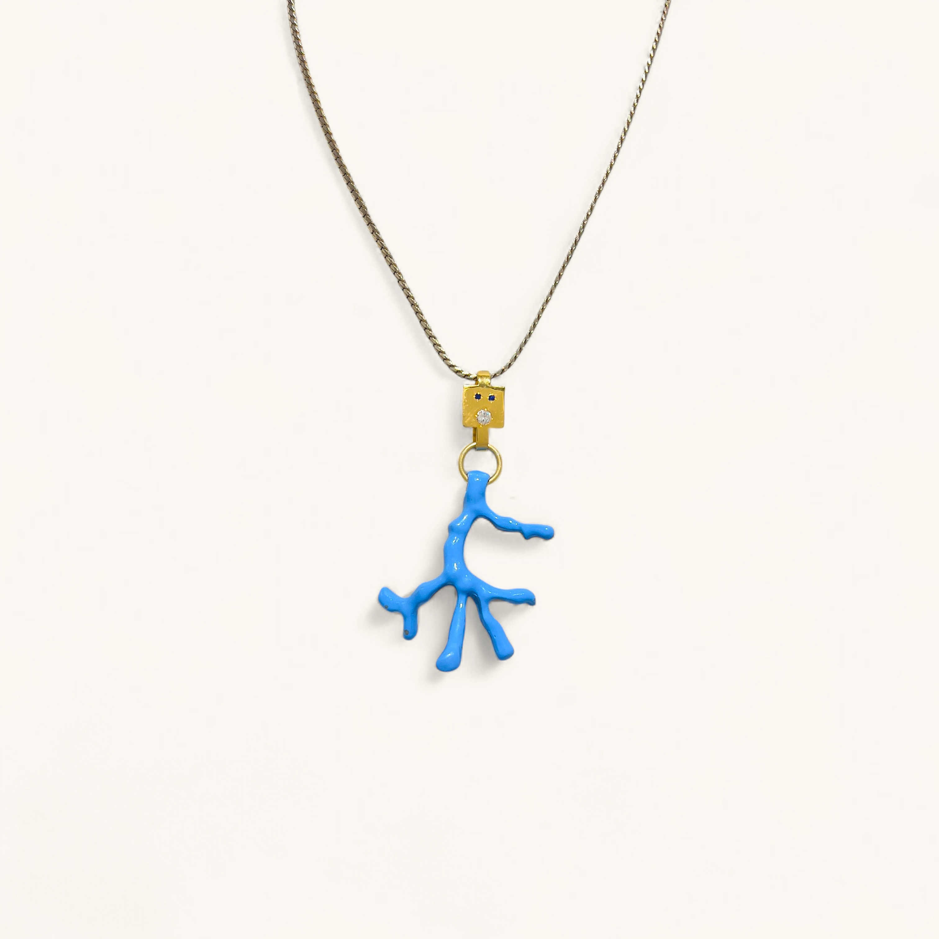 Sky-blue coral branch pendant with jewel-dotted golden connector.