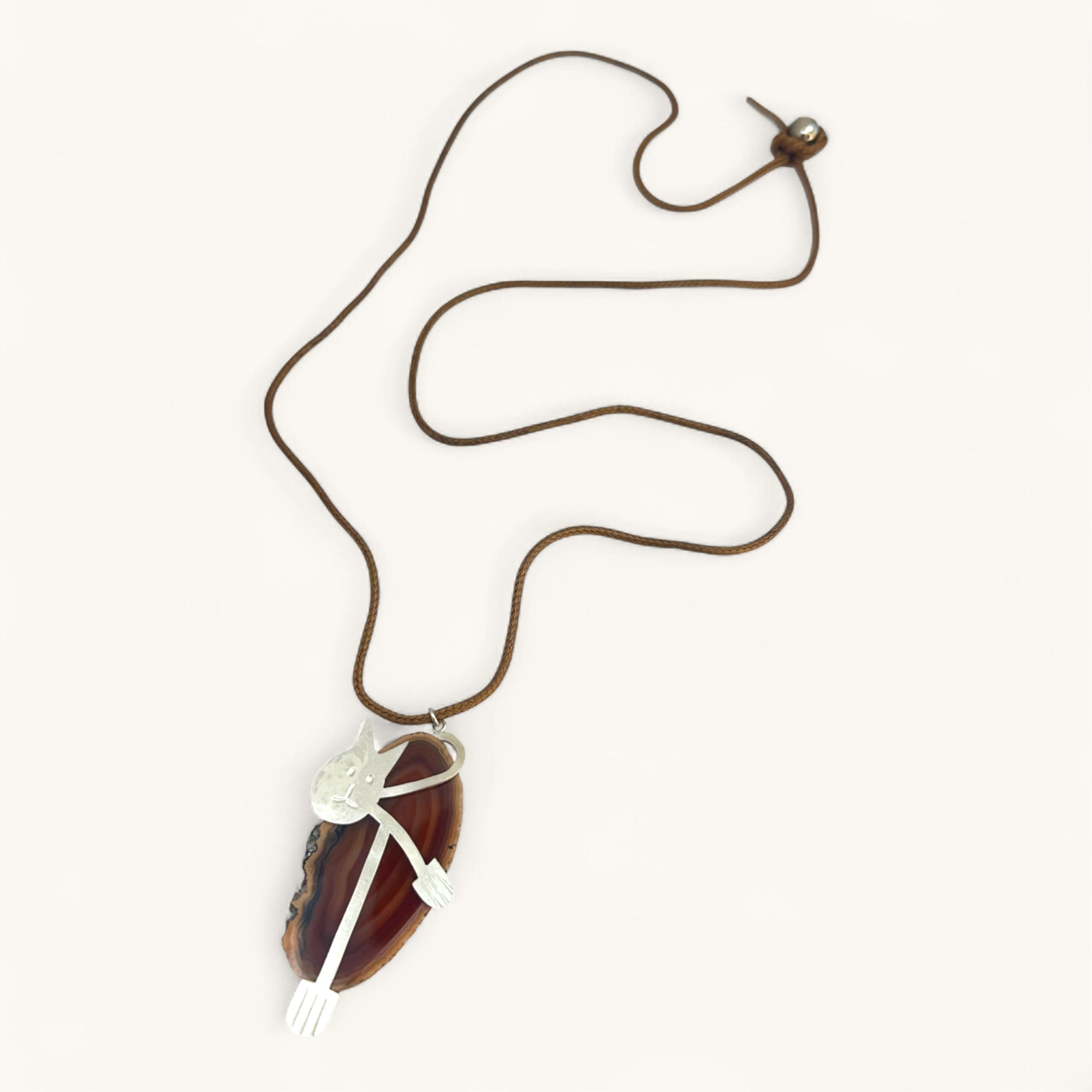 Whimsical cat silhouette hugging a warm agate slice pendant.