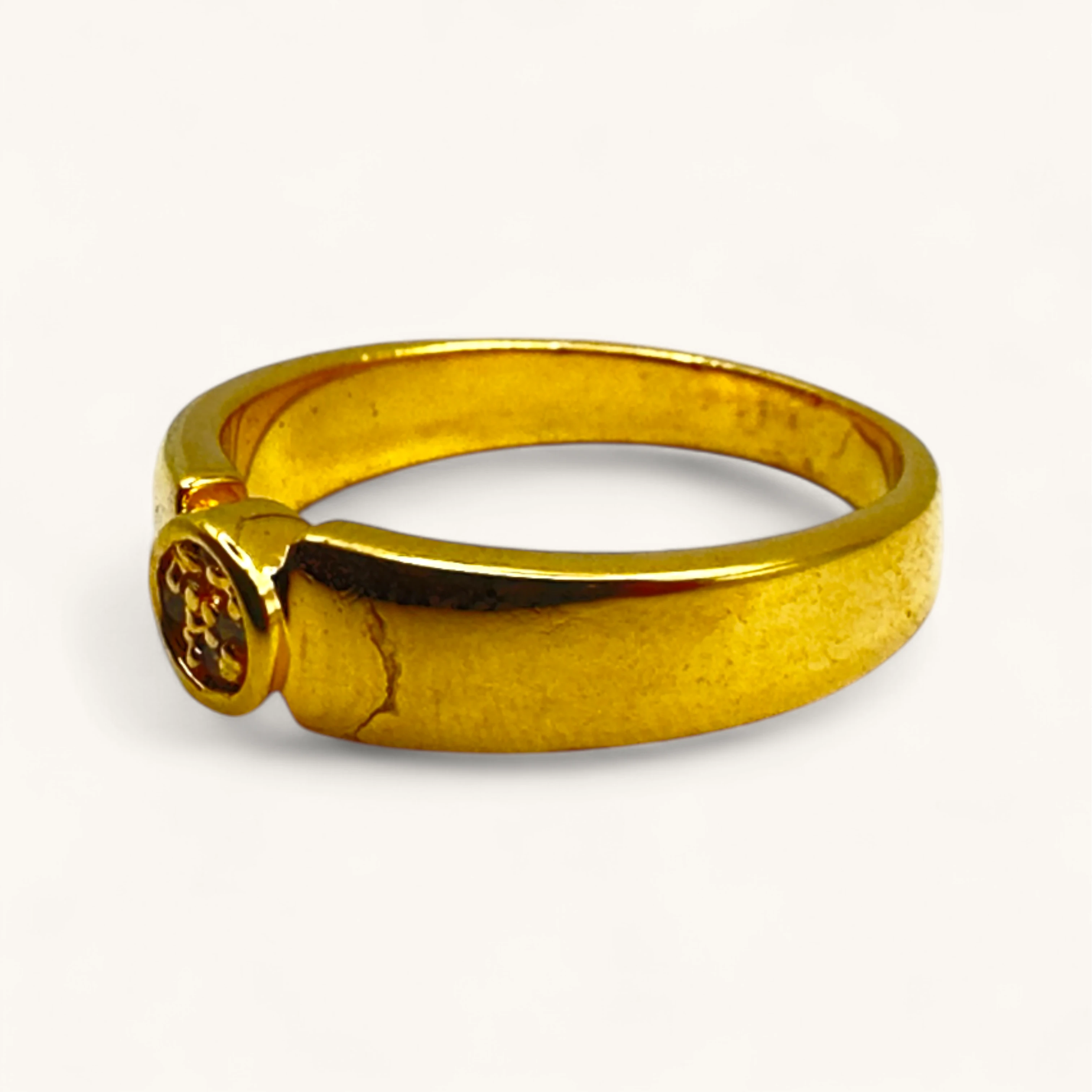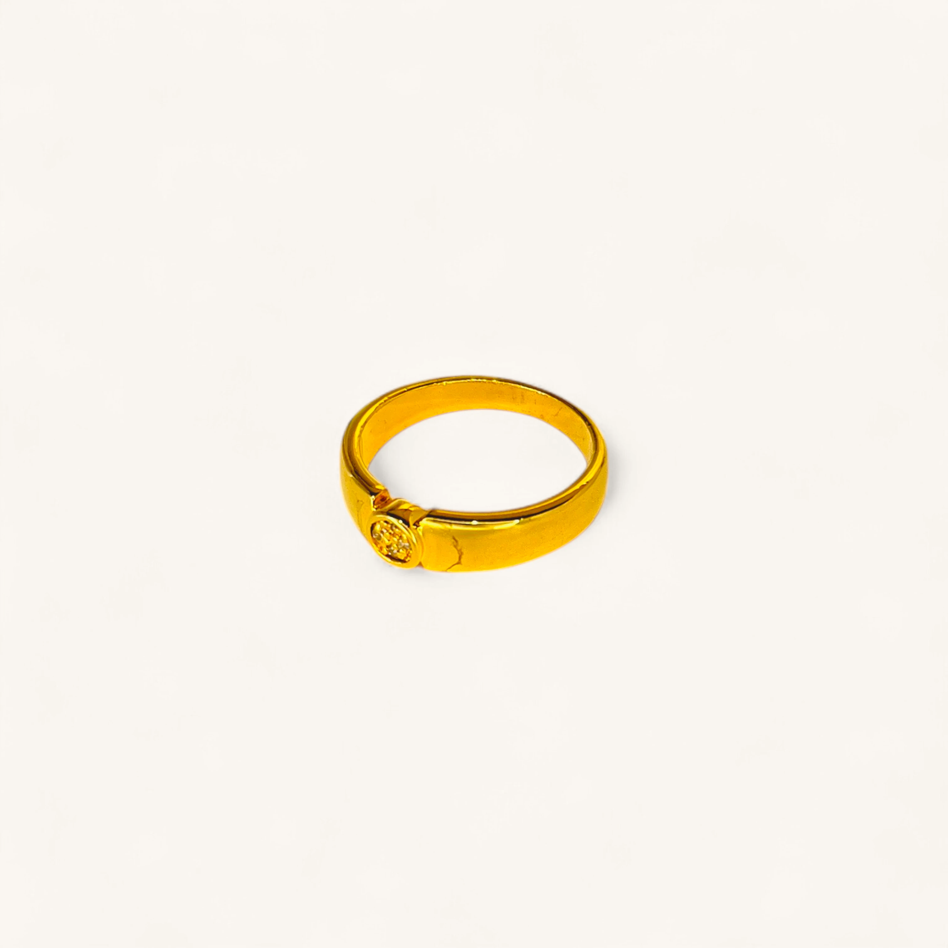This timeless gold ring features a polished band set with a single round crystal at its center. Its simple yet elegant design makes it a versatile piece, perfect for everyday wear or as a subtle statement of sophistication.