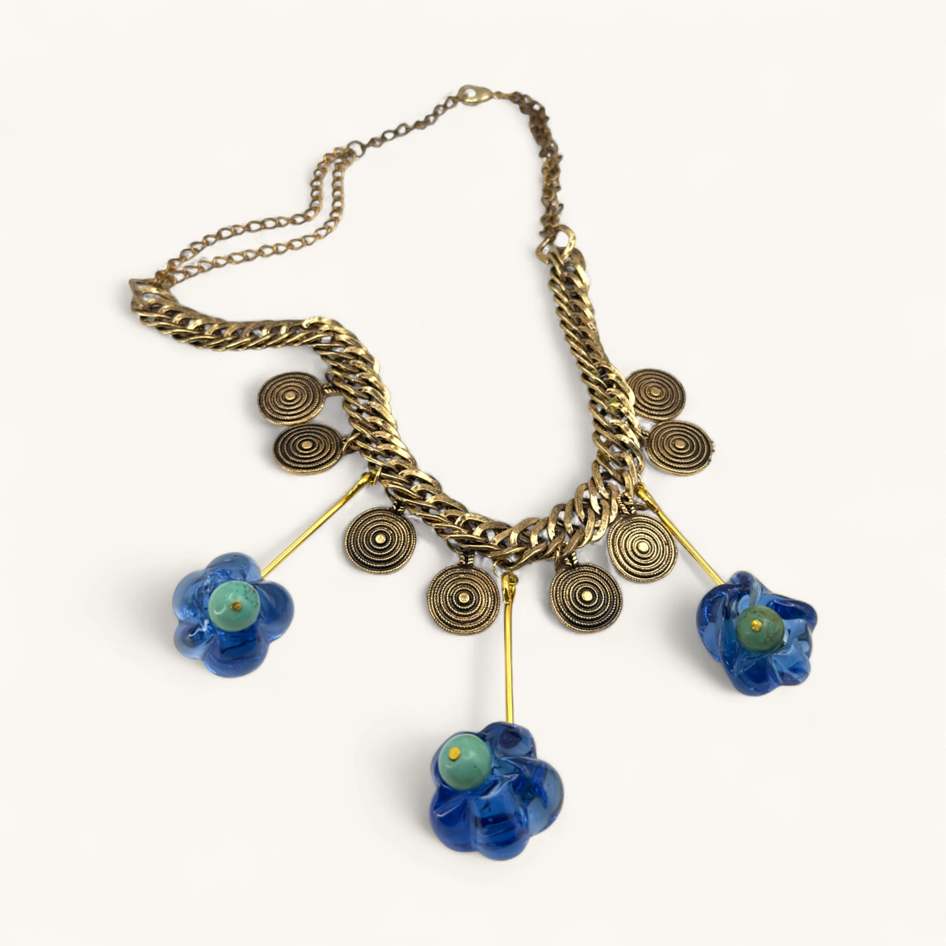 Bold chain trimmed with spiral coin charms and three dangling glass florals in ocean blue. Striking movement and shine.