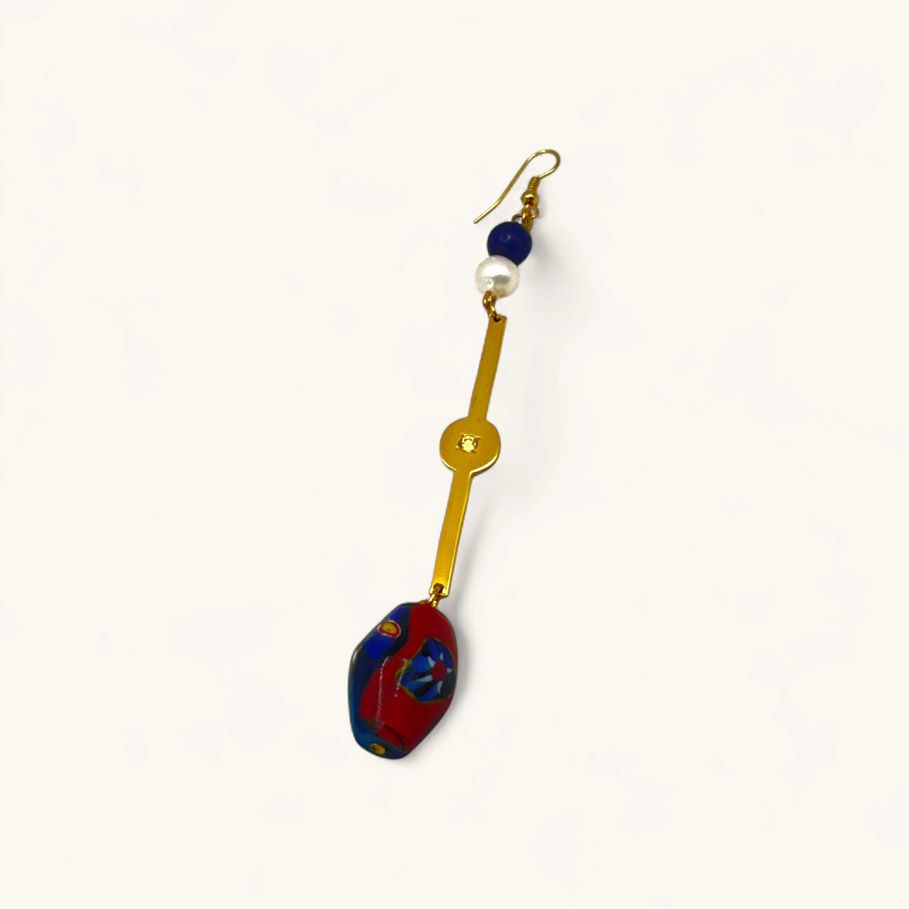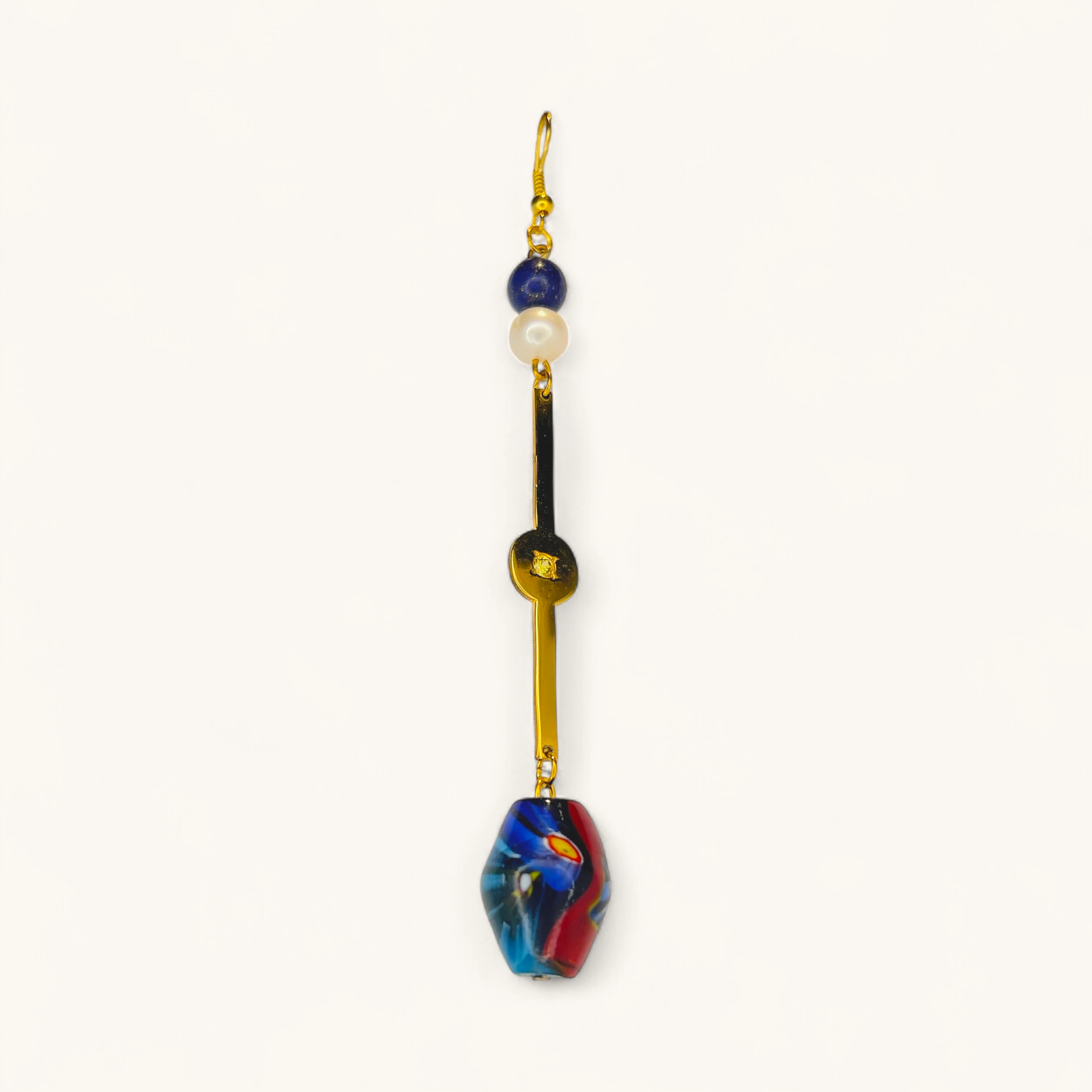 This vibrant single earring features a bold multicolored gemstone drop paired with a sleek gold bar accent, finished with a pearl and deep blue bead at the top. Its eclectic yet elegant design makes it a true statement piece, perfect for artistic and modern styling.