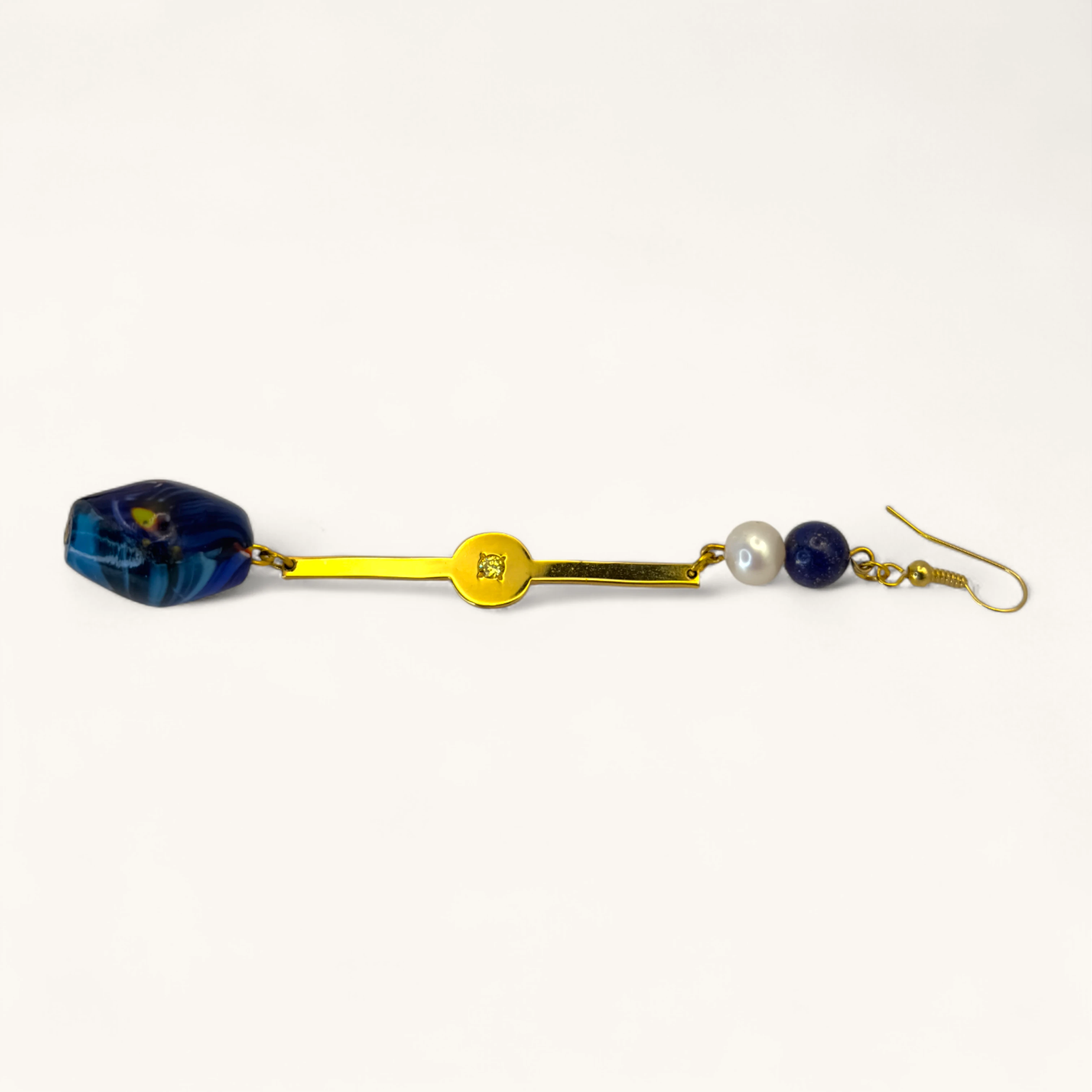 Gold bar earring with pearl, blue bead, and colorful gemstone drop.