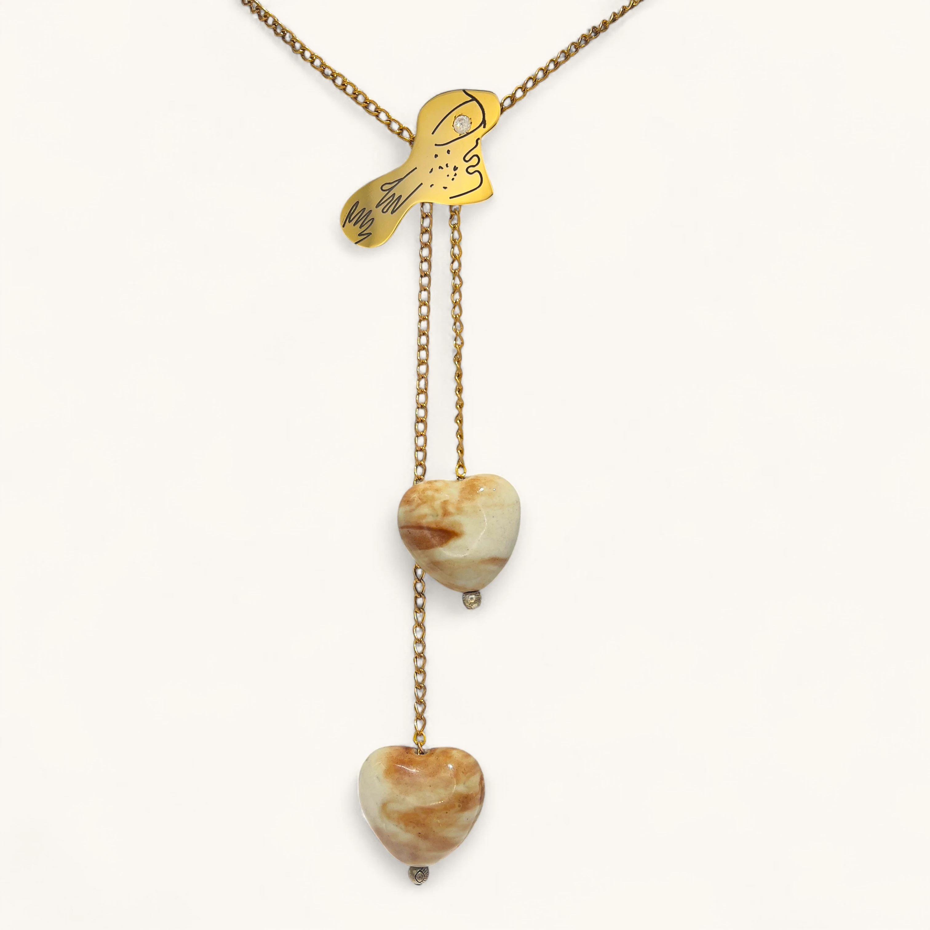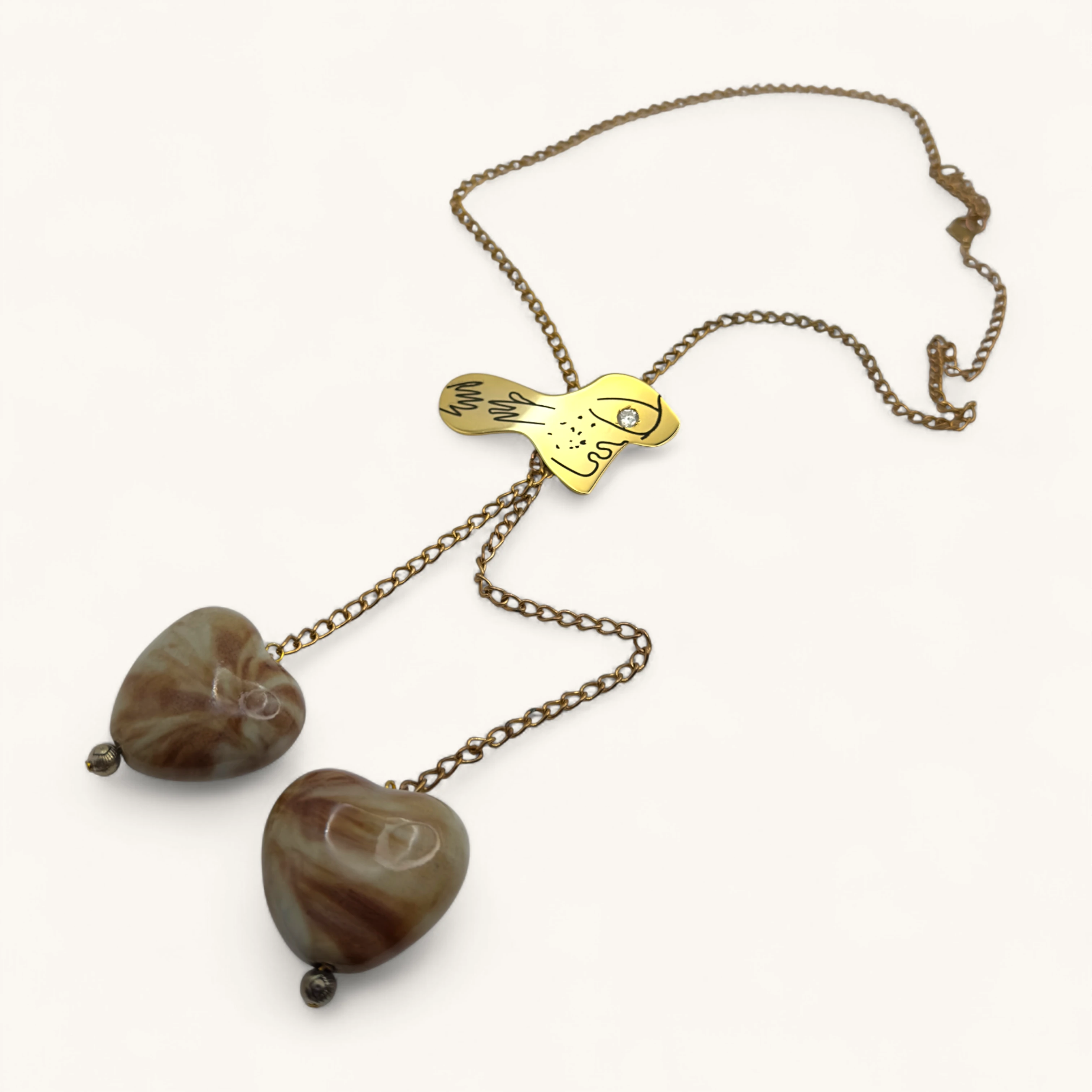 Lariat necklace with abstract face slider and two marbled stone hearts.