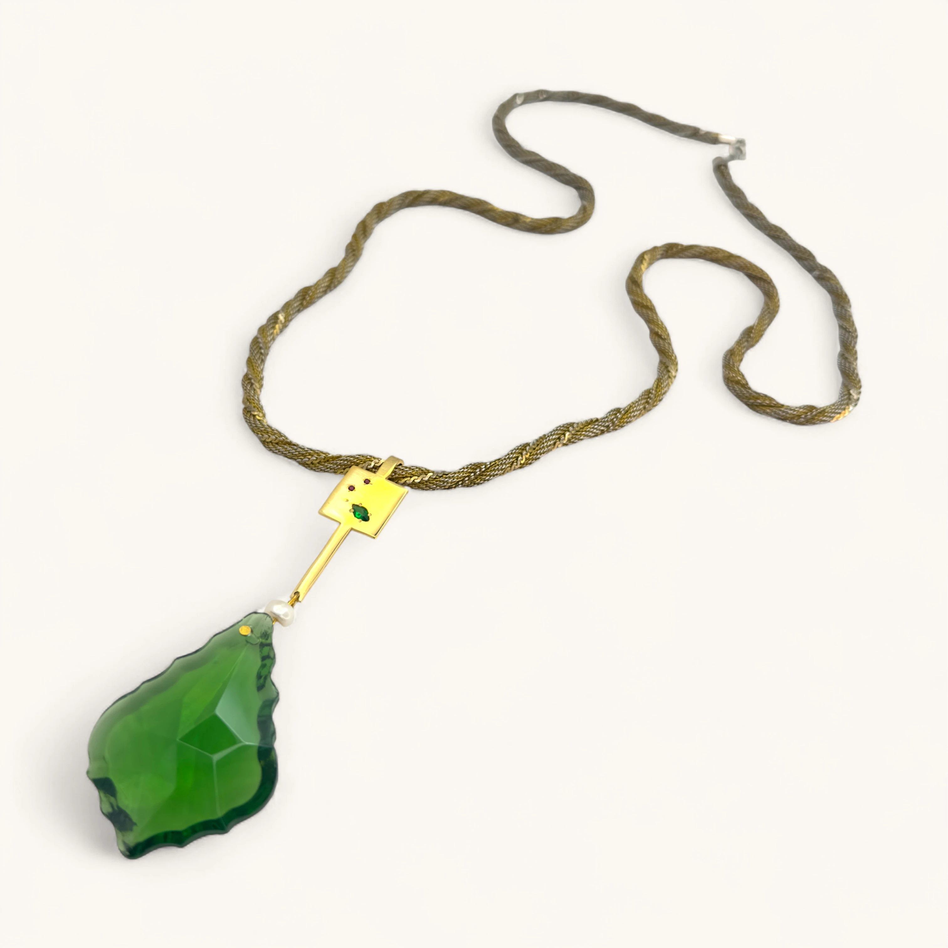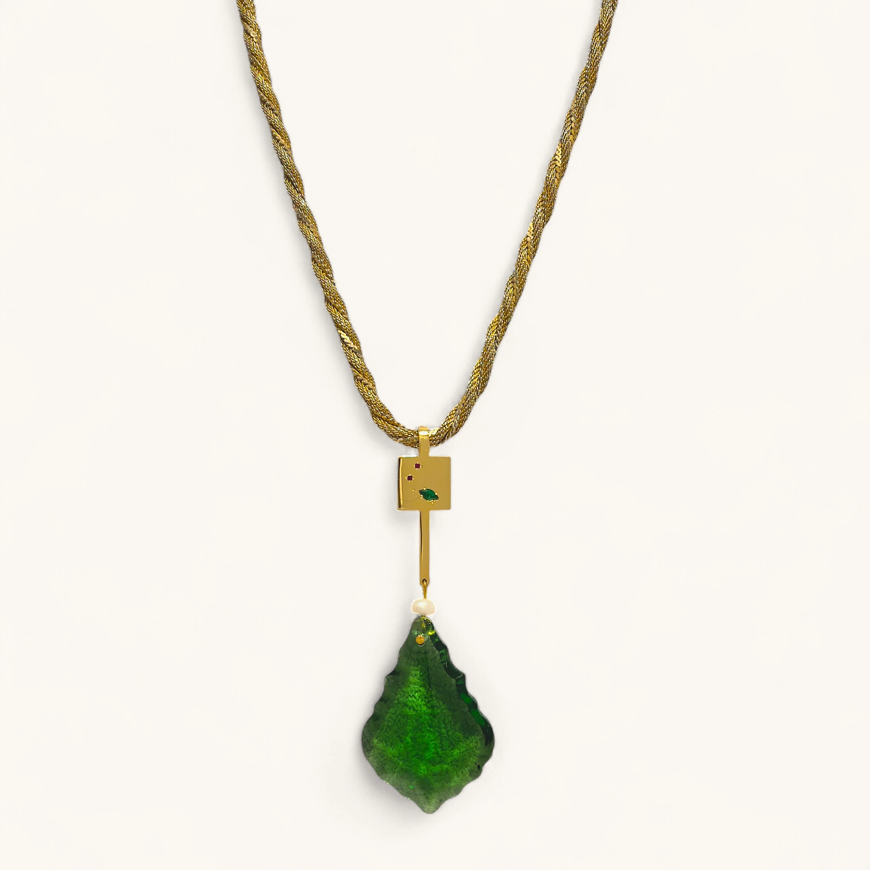 Rope‑style gold chain holds a luminous green glass leaf drop, finished with a pearl accent and jeweled connector. Rich tone and texture.