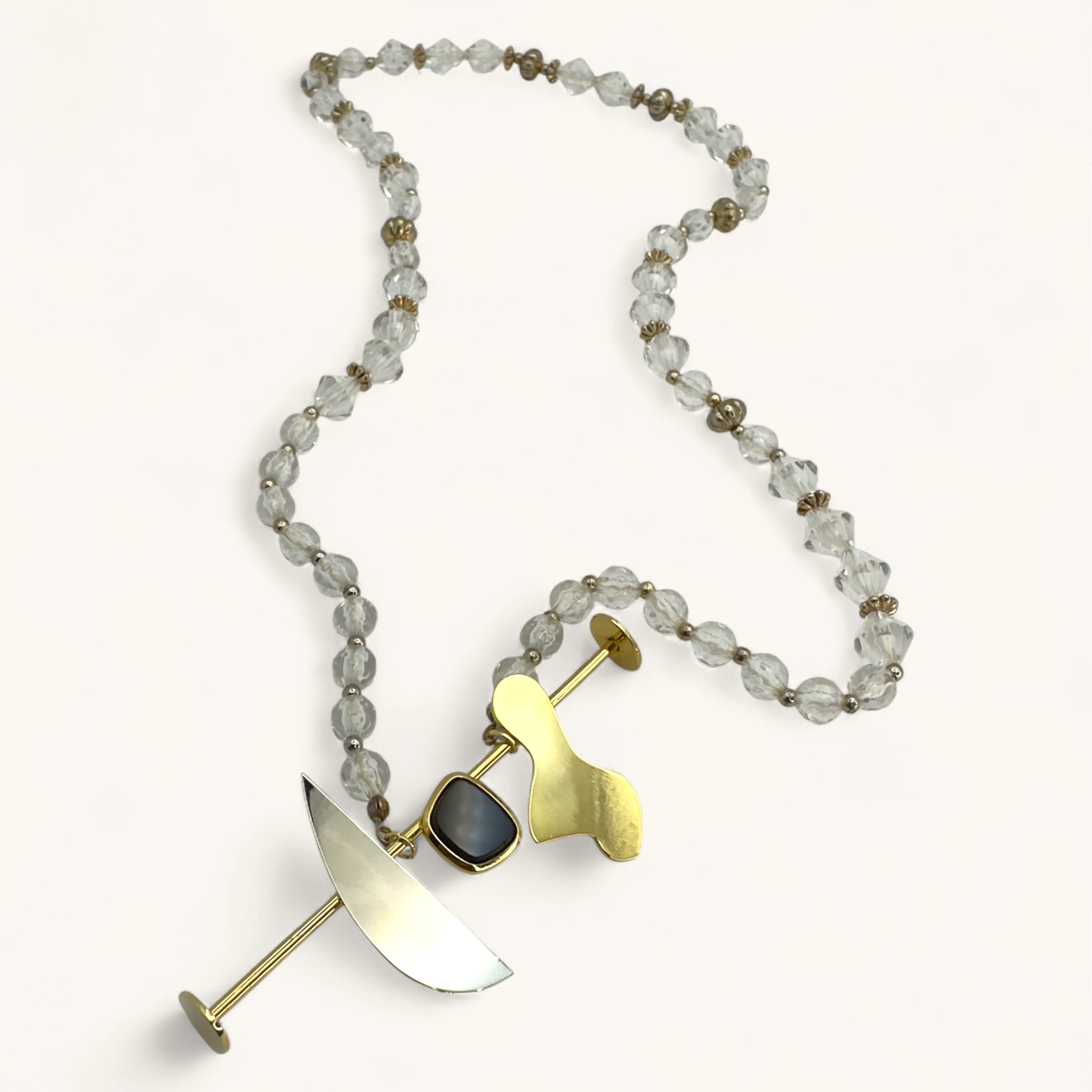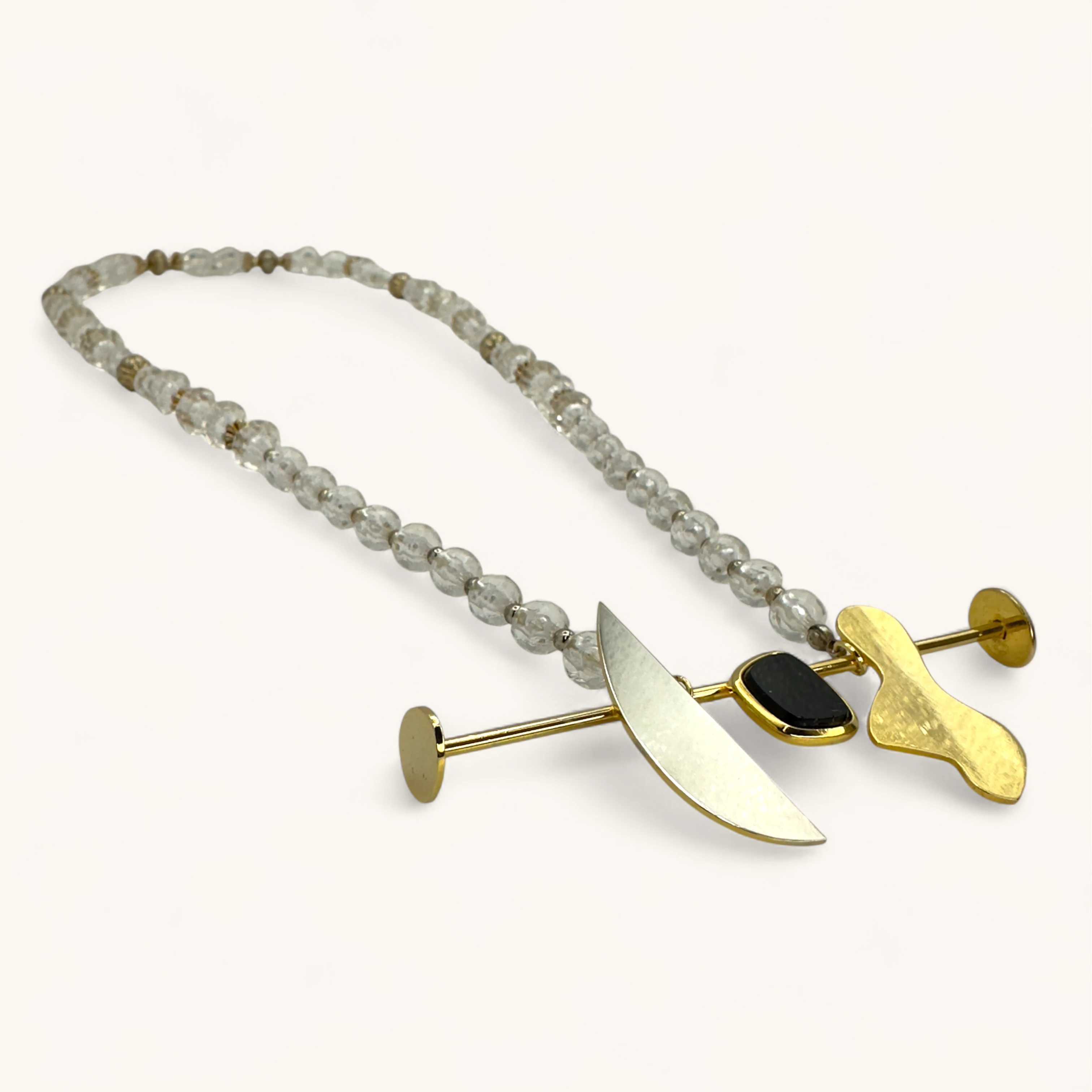 A strand of clear crystal beads supports a slim horizontal rod set with three geometric charms—matte half‑moon, onyx square, and freeform gold accent.