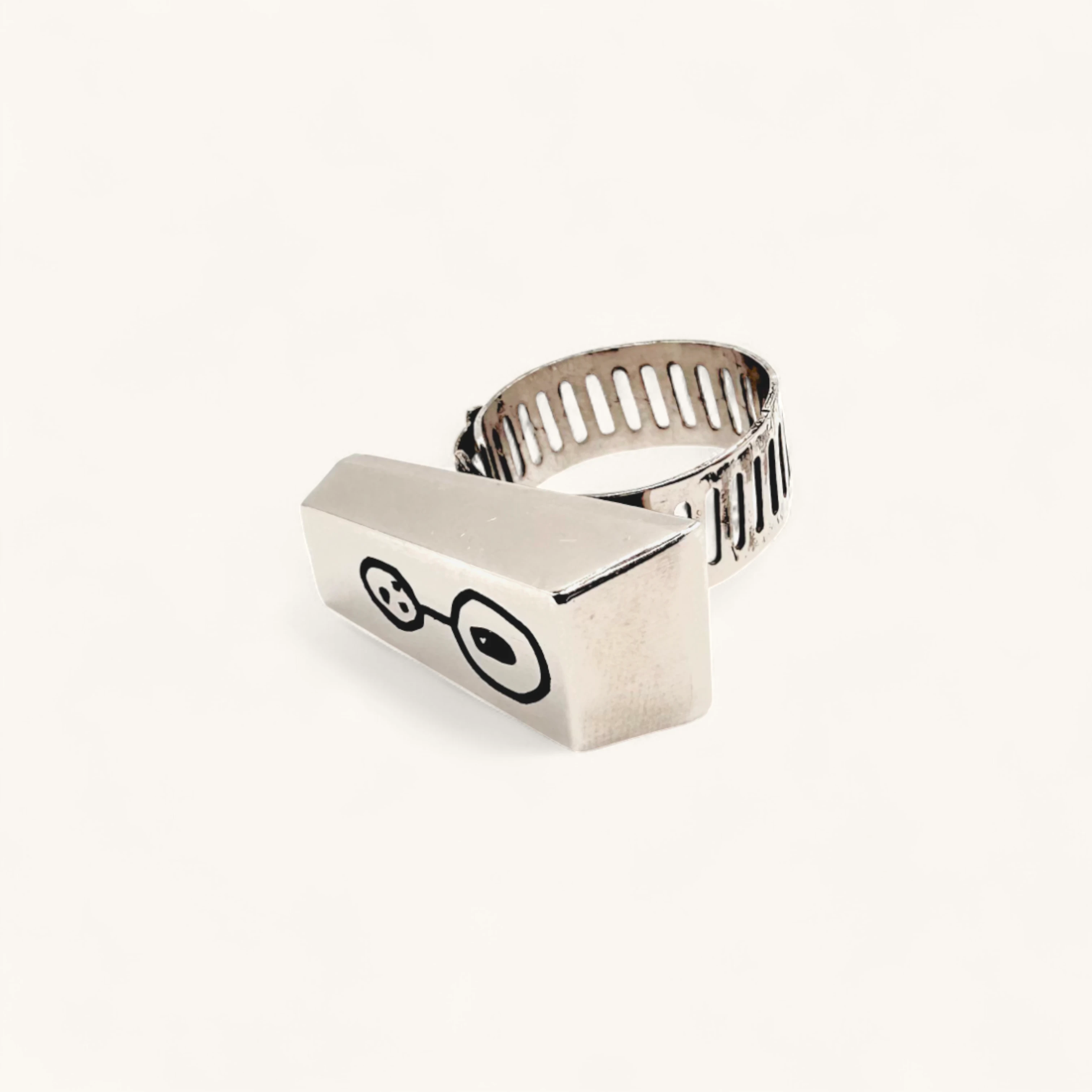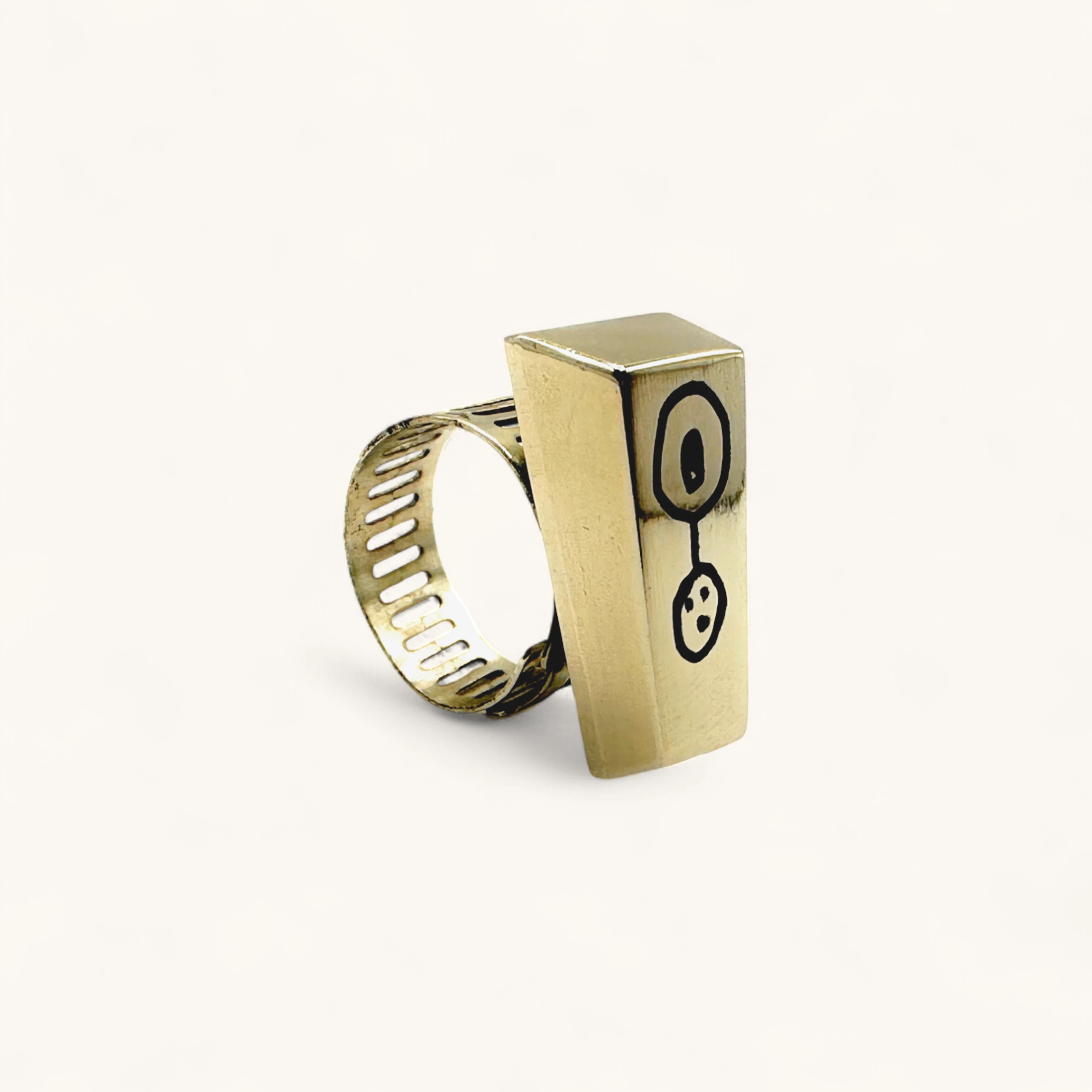 This contemporary ring features a bold rectangular block design with engraved black abstract motifs that give it a striking artistic edge. The adjustable band ensures comfort, while the polished metal finish highlights its sculptural form. Perfect for those who love statement jewelry with a modern, unconventional twist.