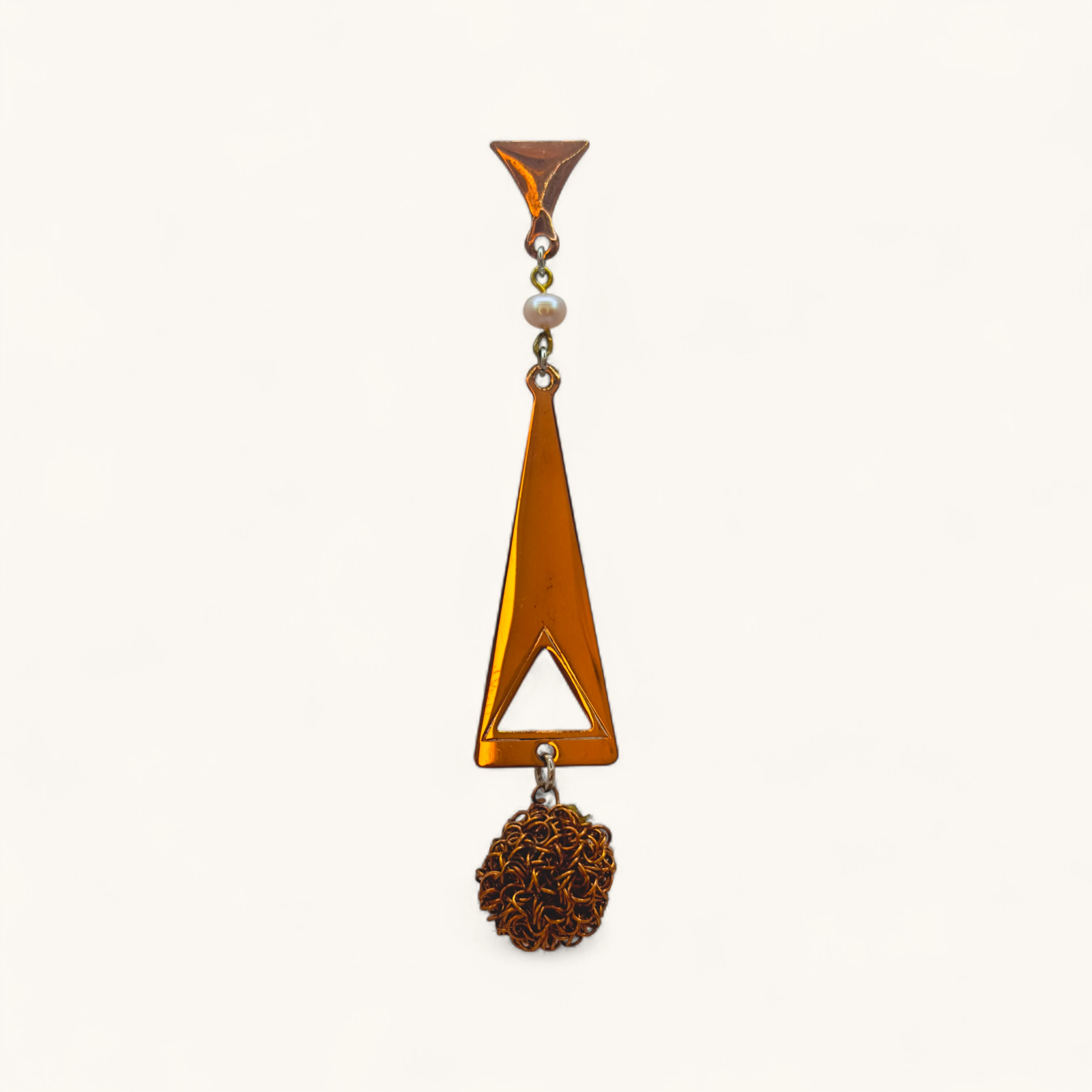 This is a statement dangle earring featuring a sleek triangular metallic piece with a cut-out center. On one end, it is accented with a textured bronze-toned wire ball, adding an artistic, handcrafted touch. The opposite side is finished with a small pearl bead and a stud-style hook for fastening. The design contrasts modern minimalism (geometric metal shape) with organic detail (woven wire sphere and pearl), making it both edgy and elegant.