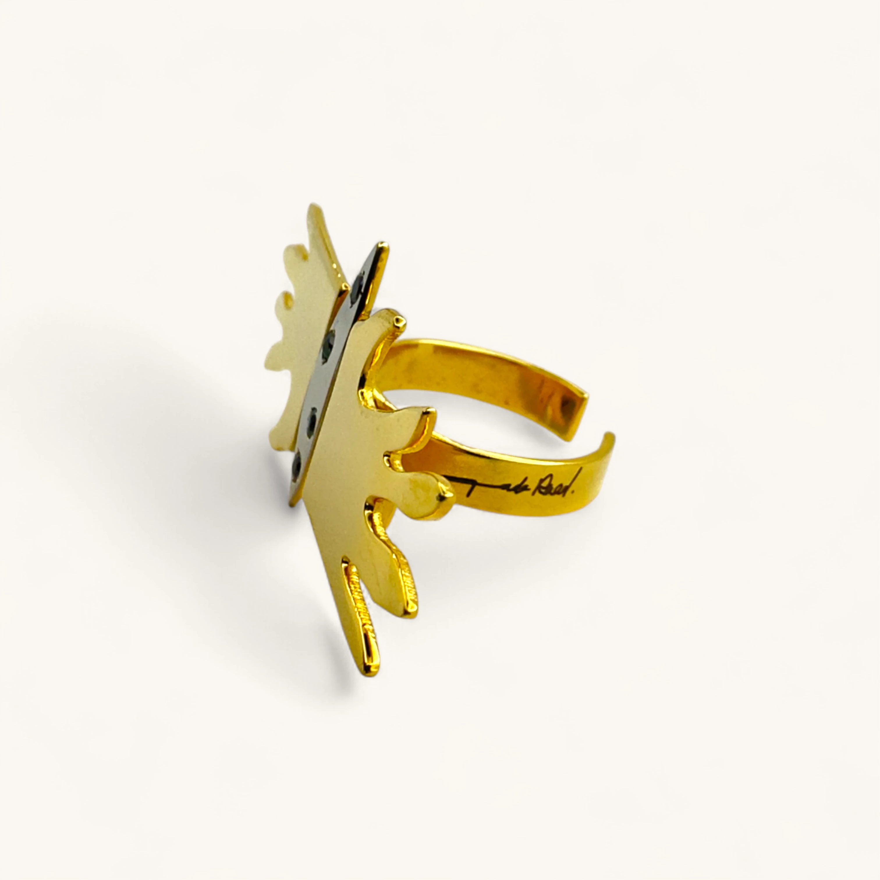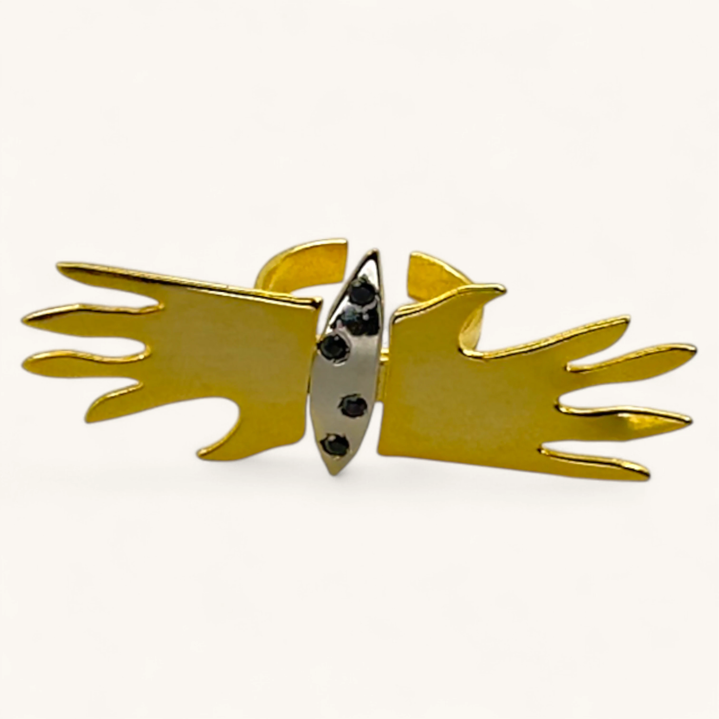 This bold ring features an open gold band with sculptural wing-like extensions, accented by small embedded crystals. Its striking design blends elegance with strength, making it the perfect accessory for those who love standout statement jewelry.