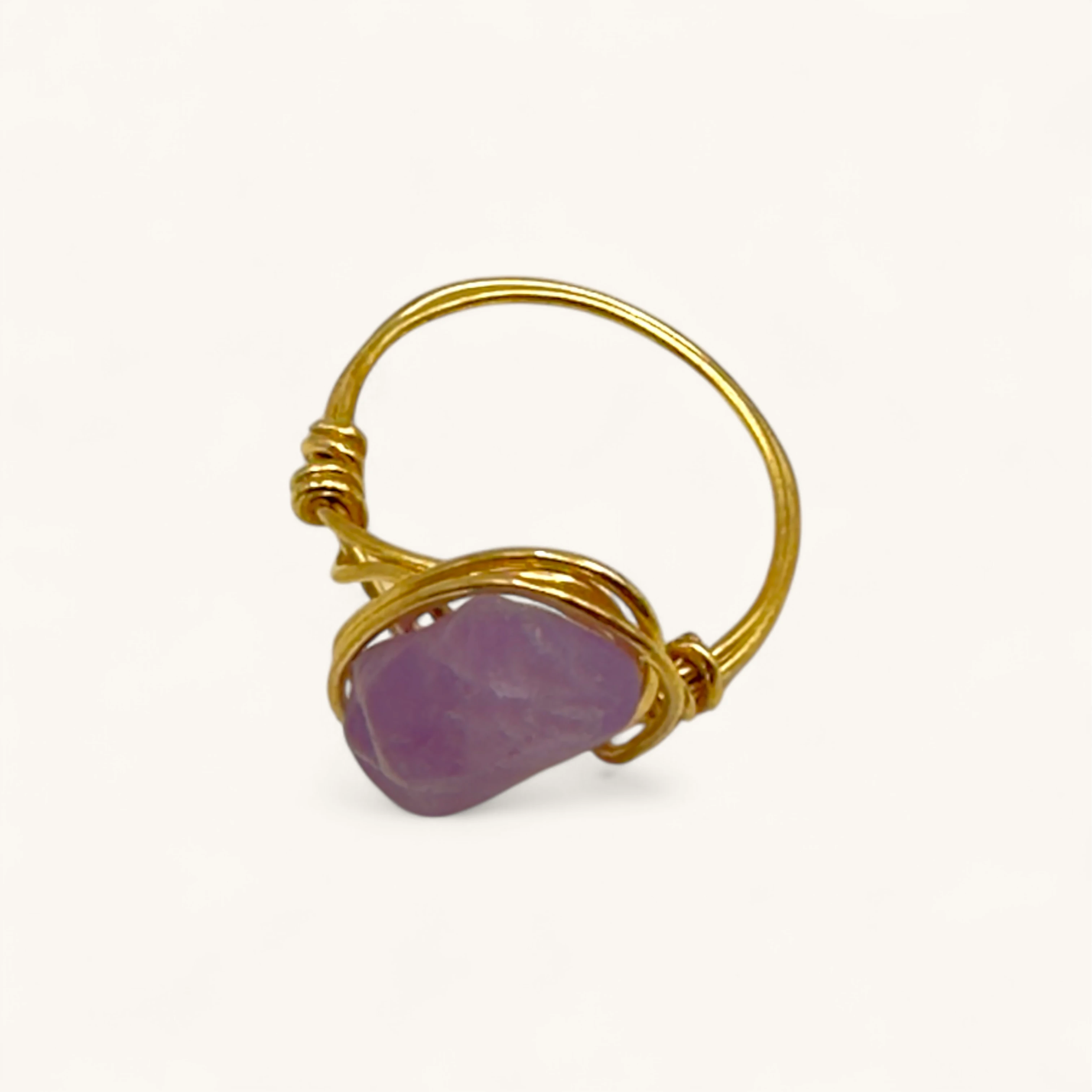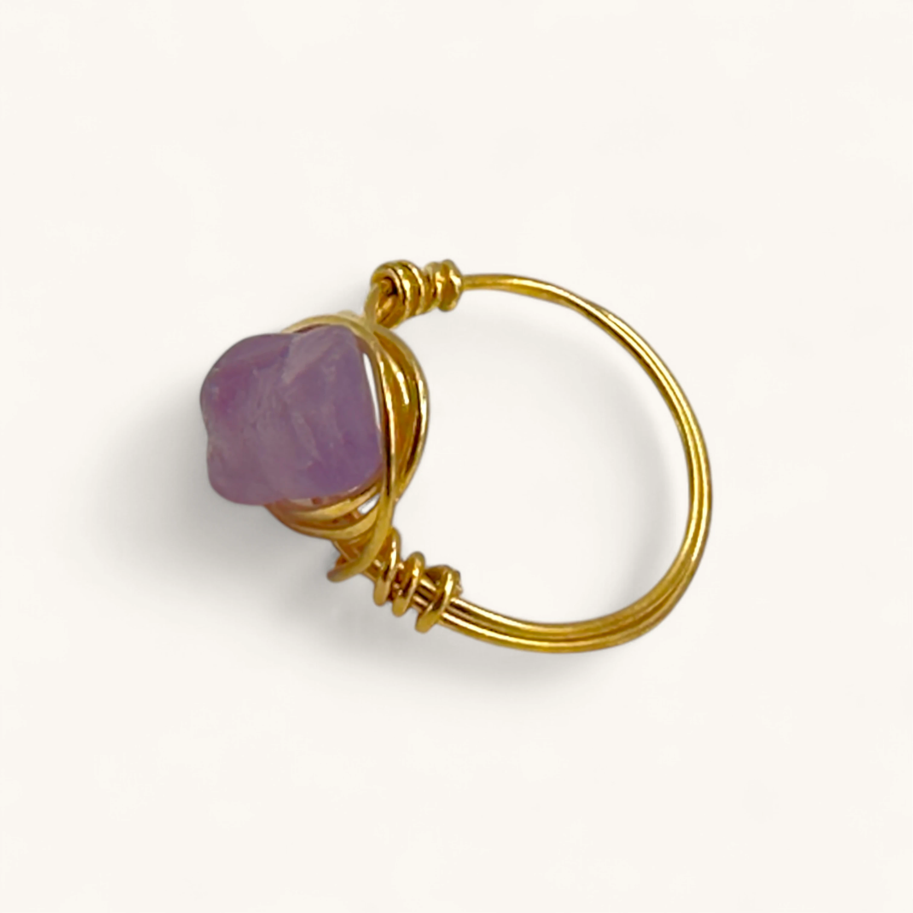 This handcrafted ring features a minimalist gold wire band wrapped around a raw purple stone. Its organic design and vibrant gemstone make it a unique accessory, perfect for adding a touch of artistry and color to any look.