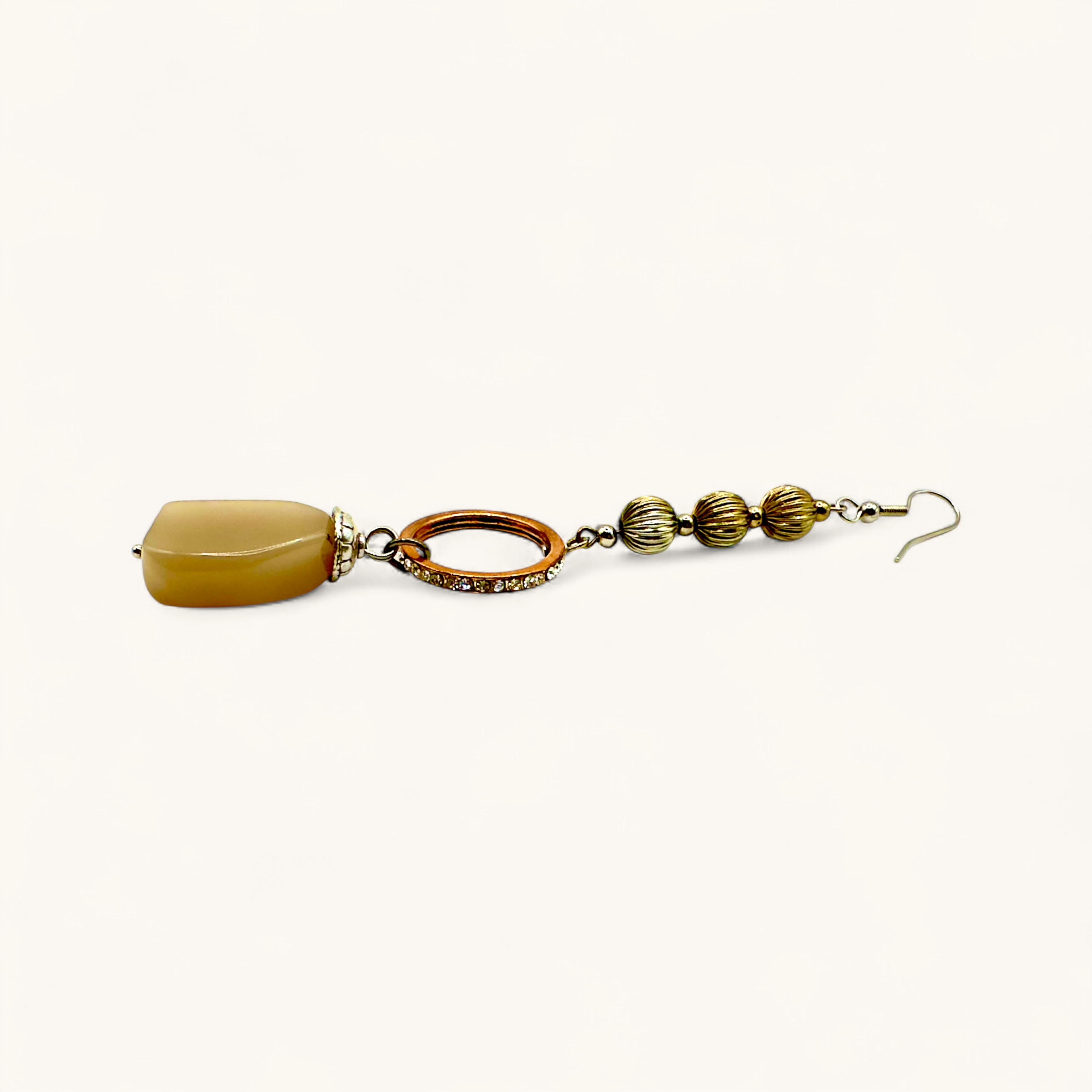 These elegant earrings feature a trio of textured golden beads leading to a sparkling crystal-studded ring and a smooth, polished golden gemstone drop. Their sophisticated yet artistic design makes them an ideal choice for adding charm to both casual and formal looks.
