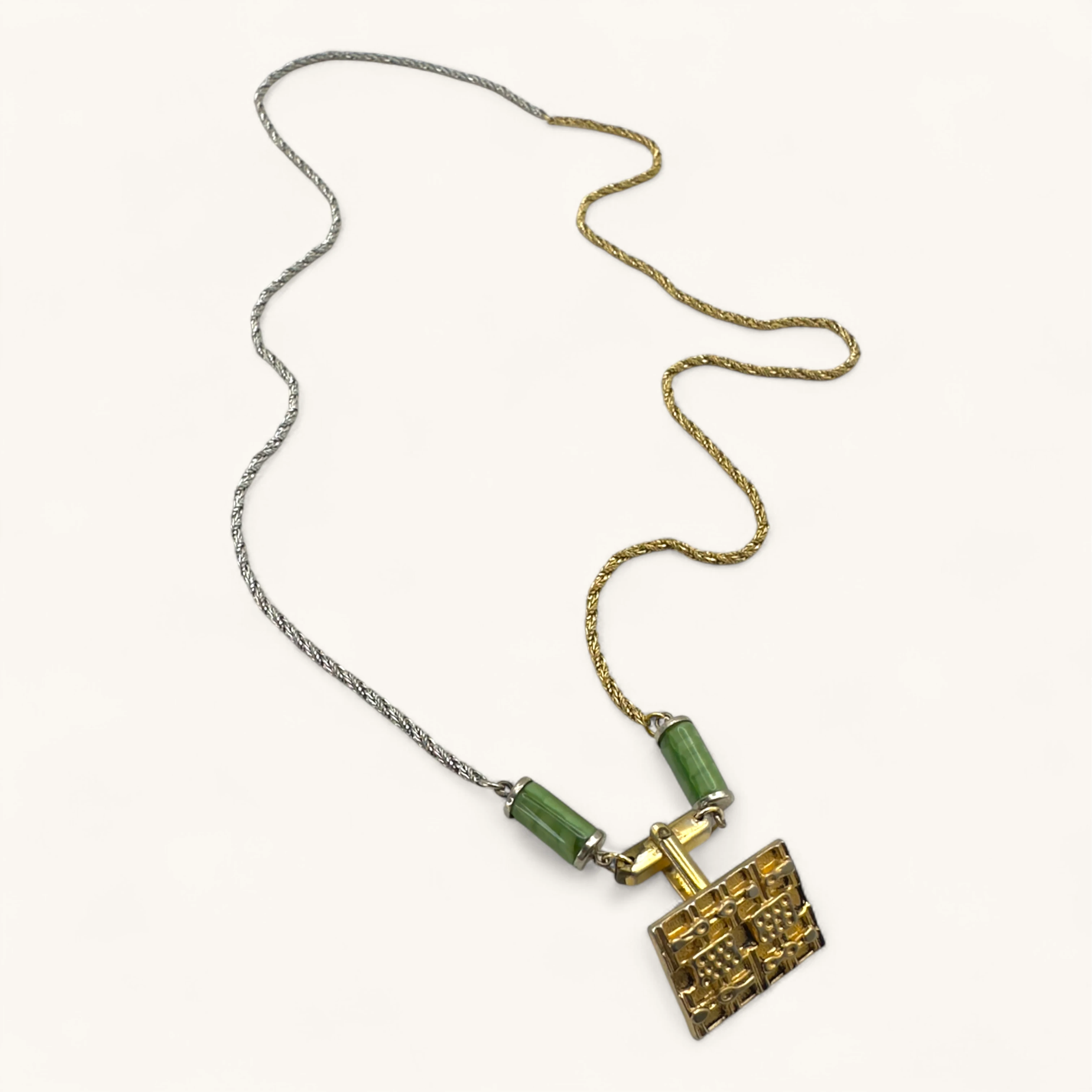 Statement necklace with a split-tone chain (silver and gold), accented by green enamel cylinders and a textured golden rectangular pendant. Unique and modern.