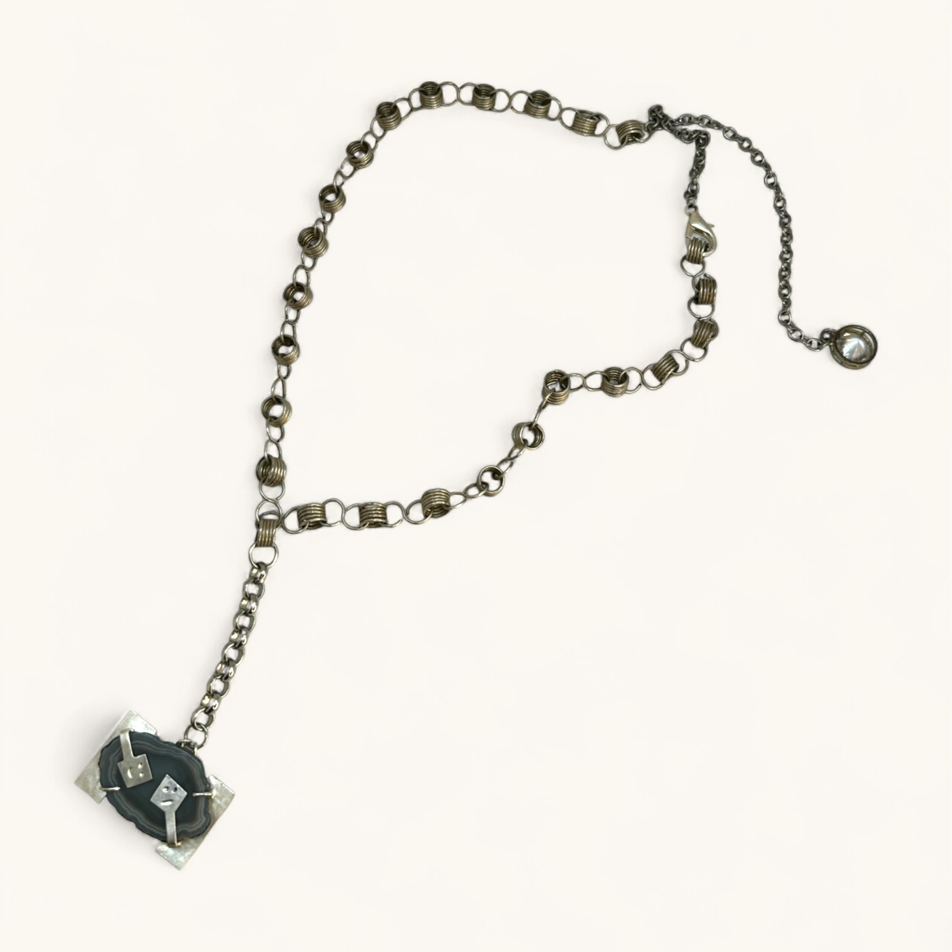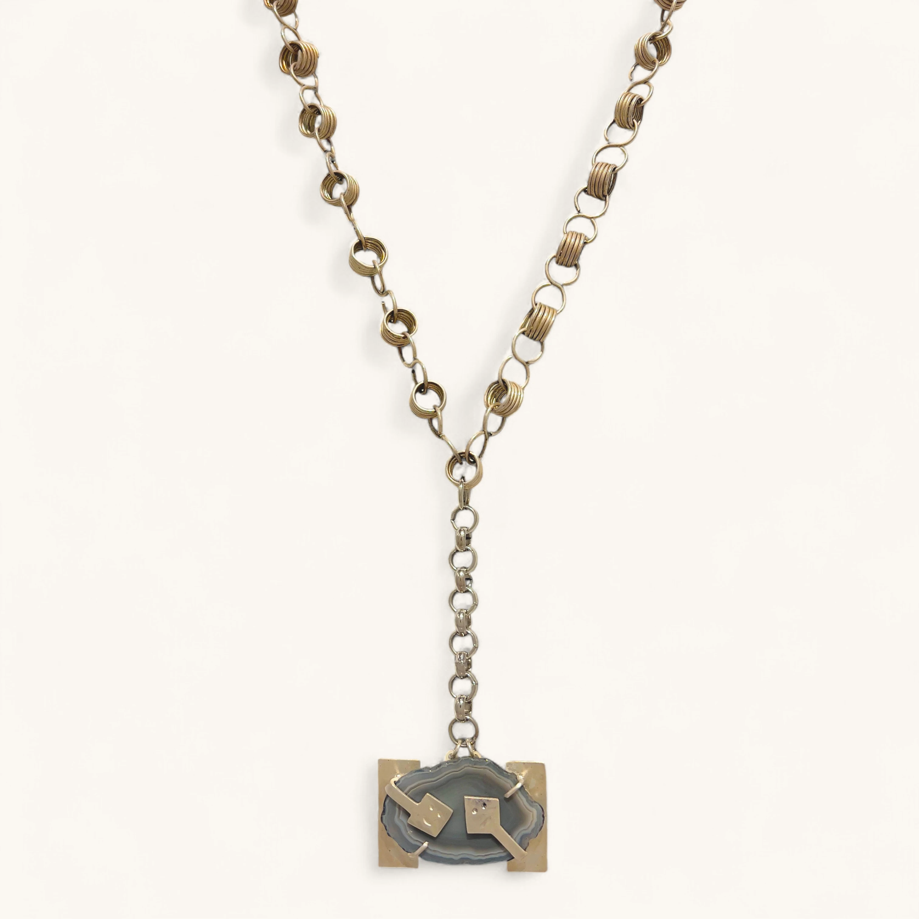 Industrial Y-necklace highlighting a framed grey agate plaque suspended from a mixed-link chain. Minimal geometry meets organic stone.