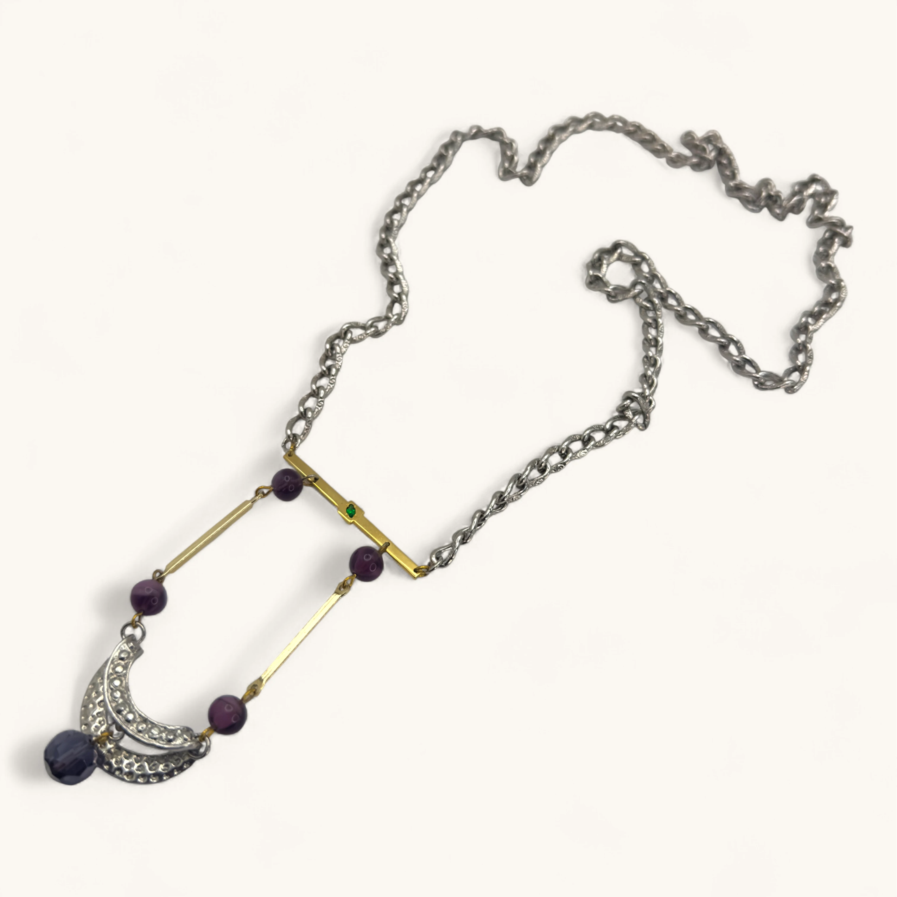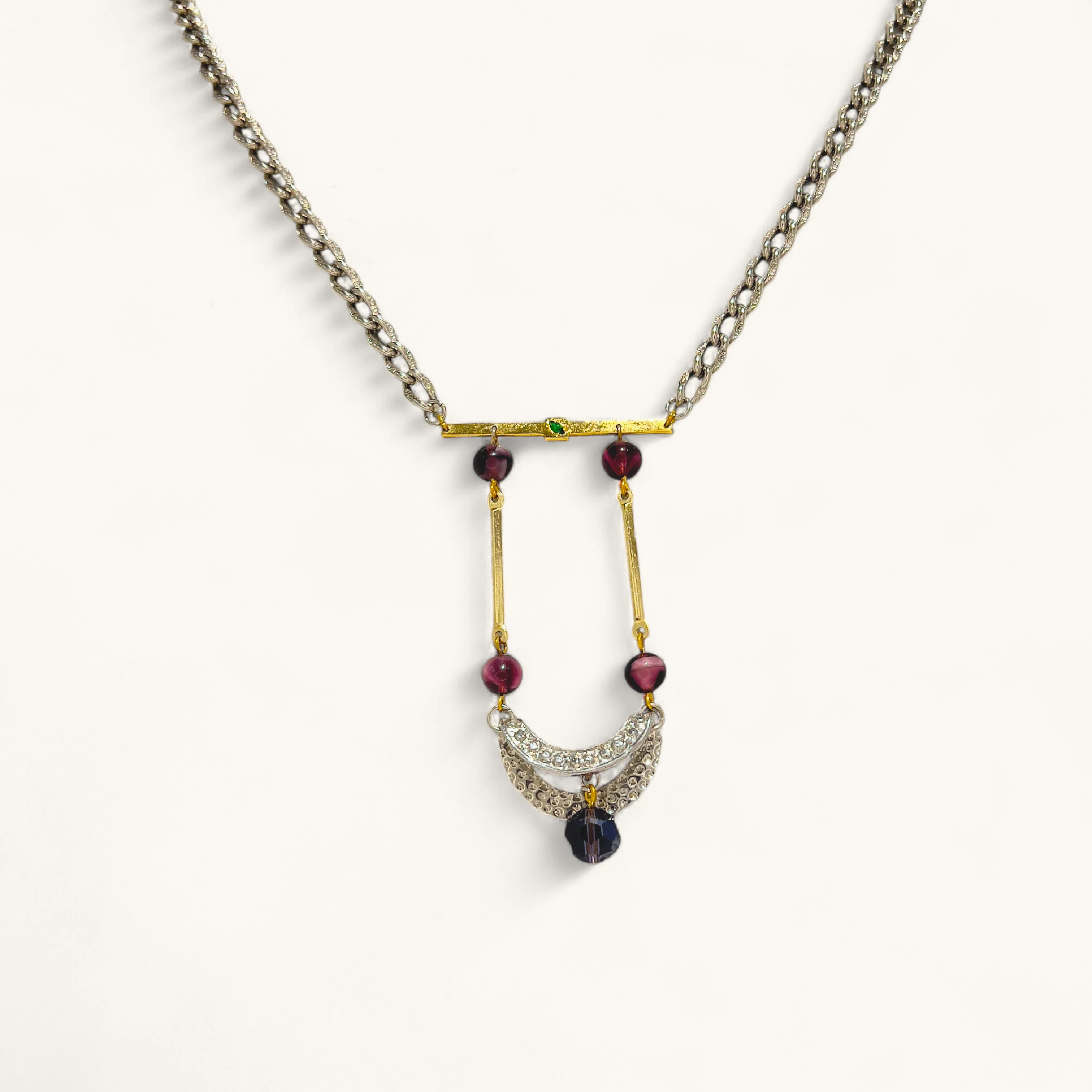 Hammered square frame set with a vivid red crystal; an extended lariat drop finishes with a red bead for extra drama.
