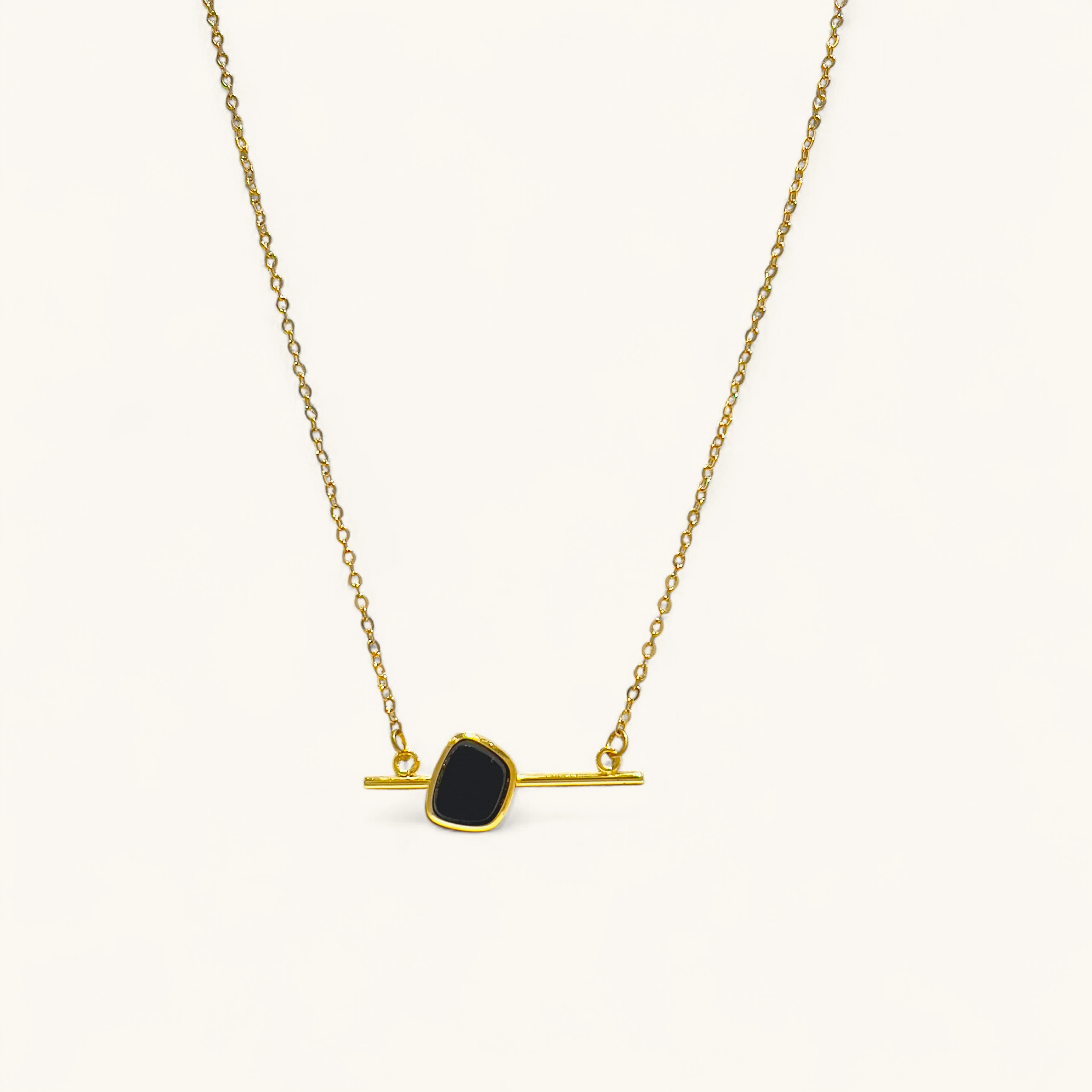 Minimalist necklace with a petite black stone in a golden bezel resting on a slim horizontal bar. Clean, modern, and perfect for layering.