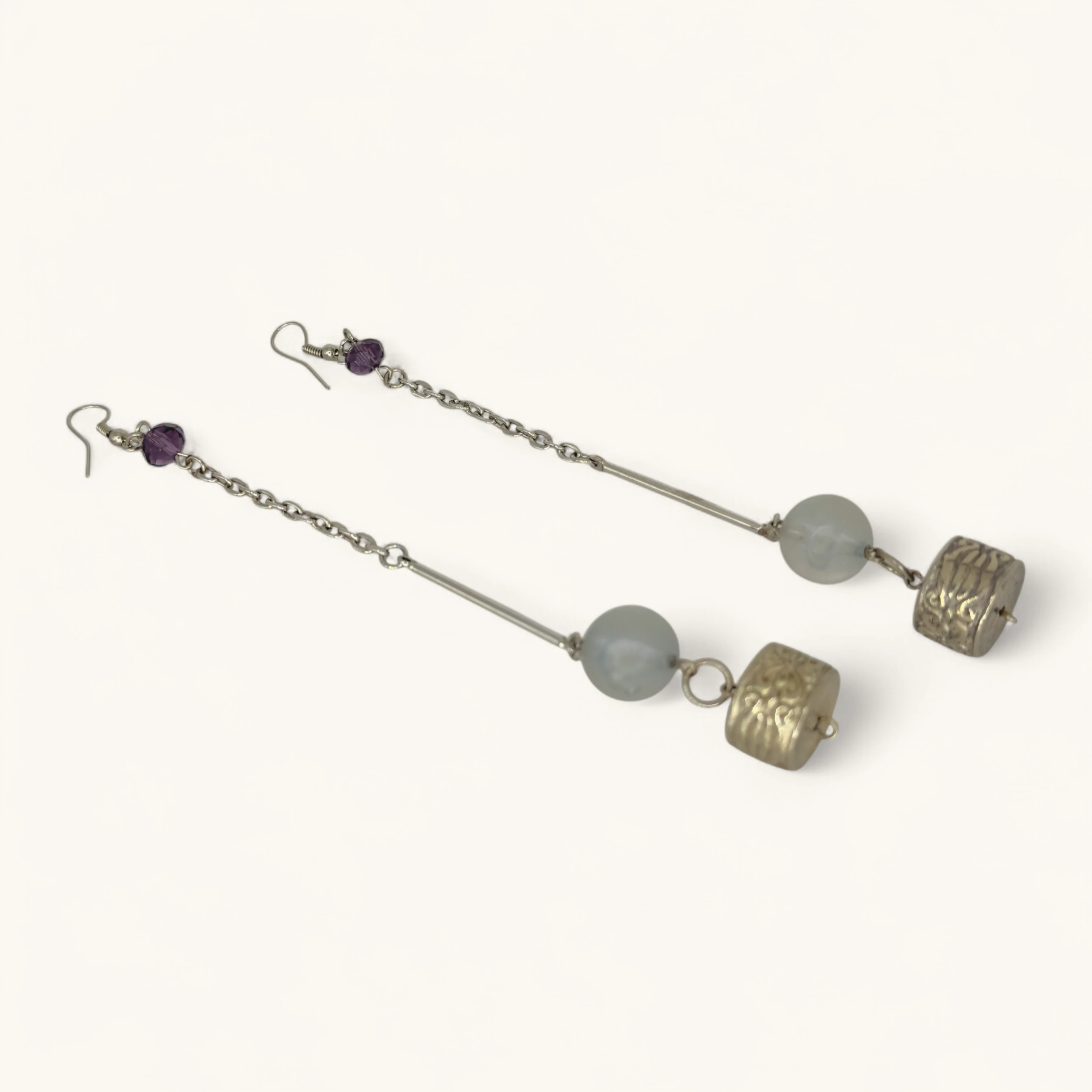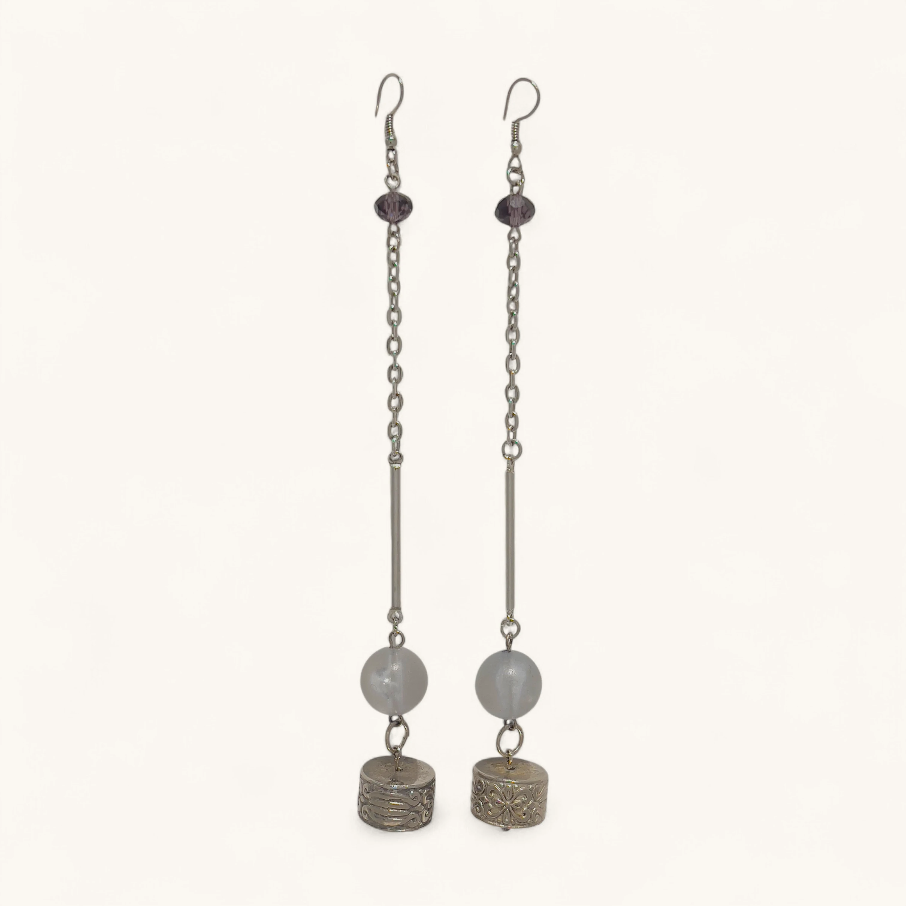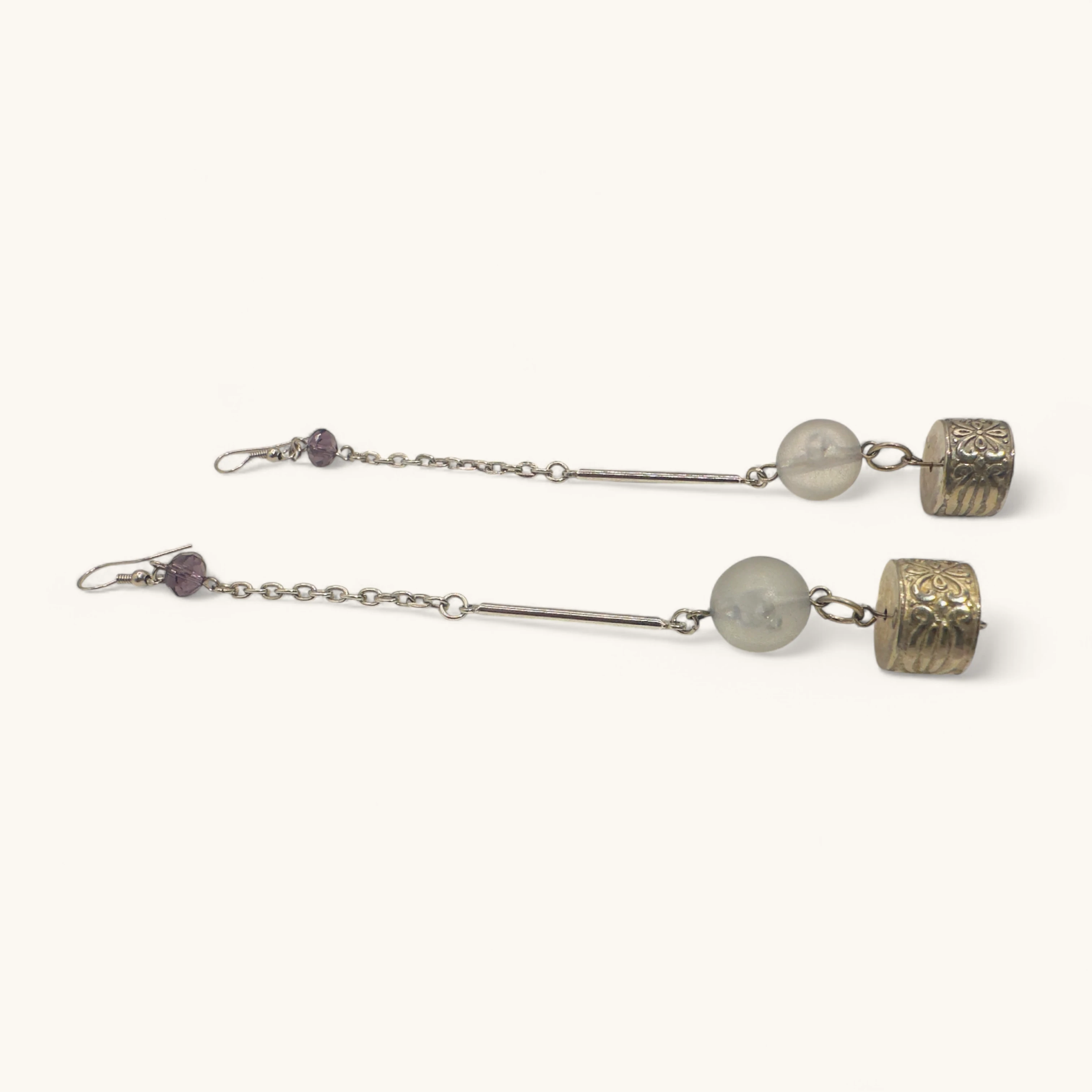 These elegant earrings feature a delicate silver chain accented with a faceted dark bead, a frosted round bead, and a textured antique-style golden drop. The combination of soft tones and metallic detailing creates a balanced look, perfect for both casual and dressy occasions.