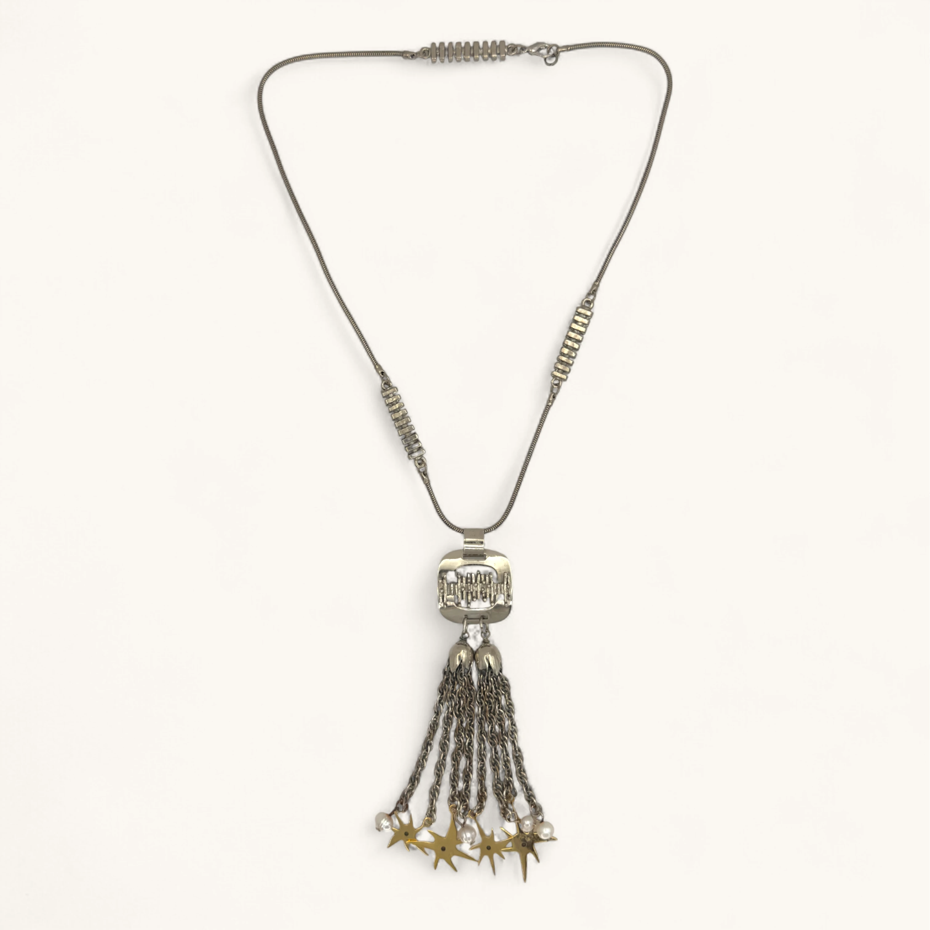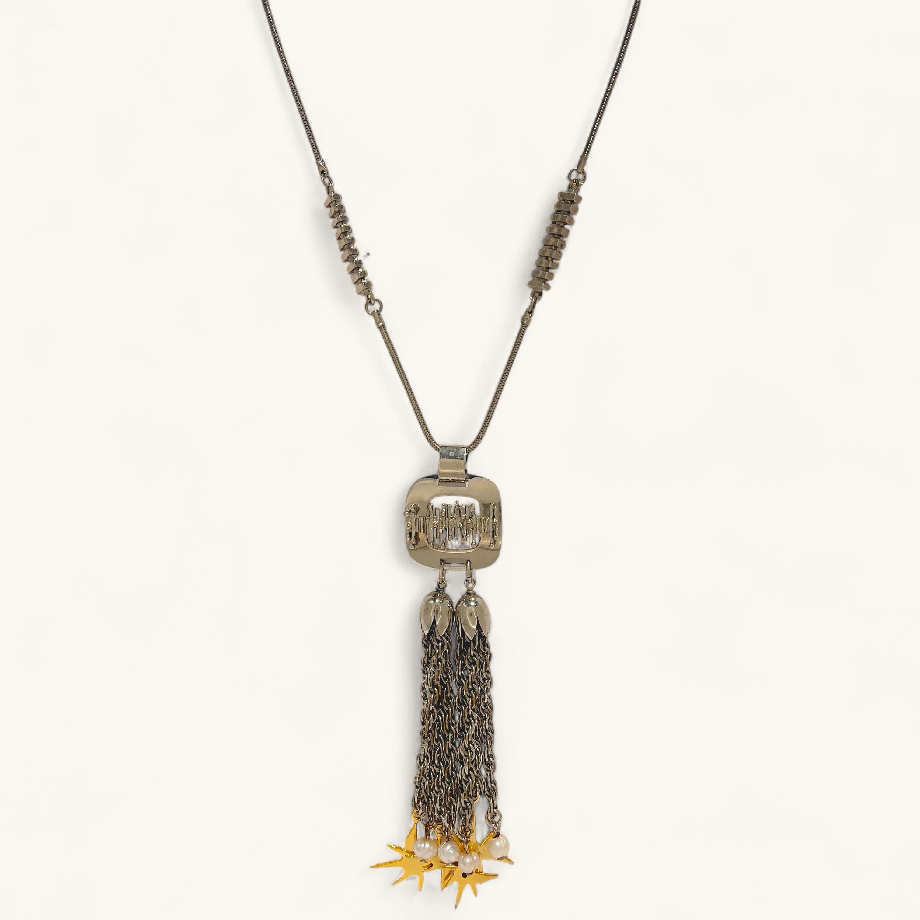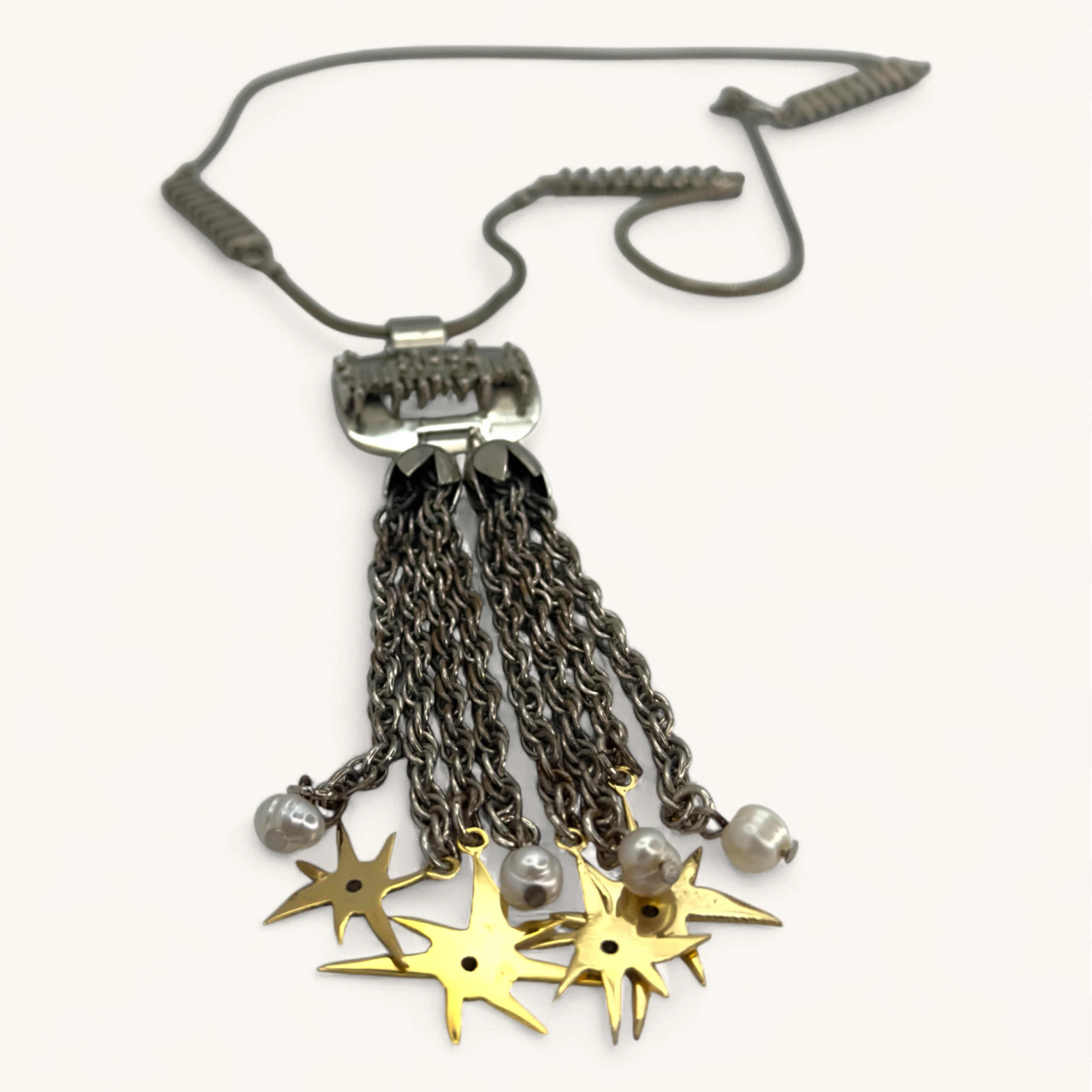 Long mixed‑metal tassel pendant with pearls and tiny gold star charms.