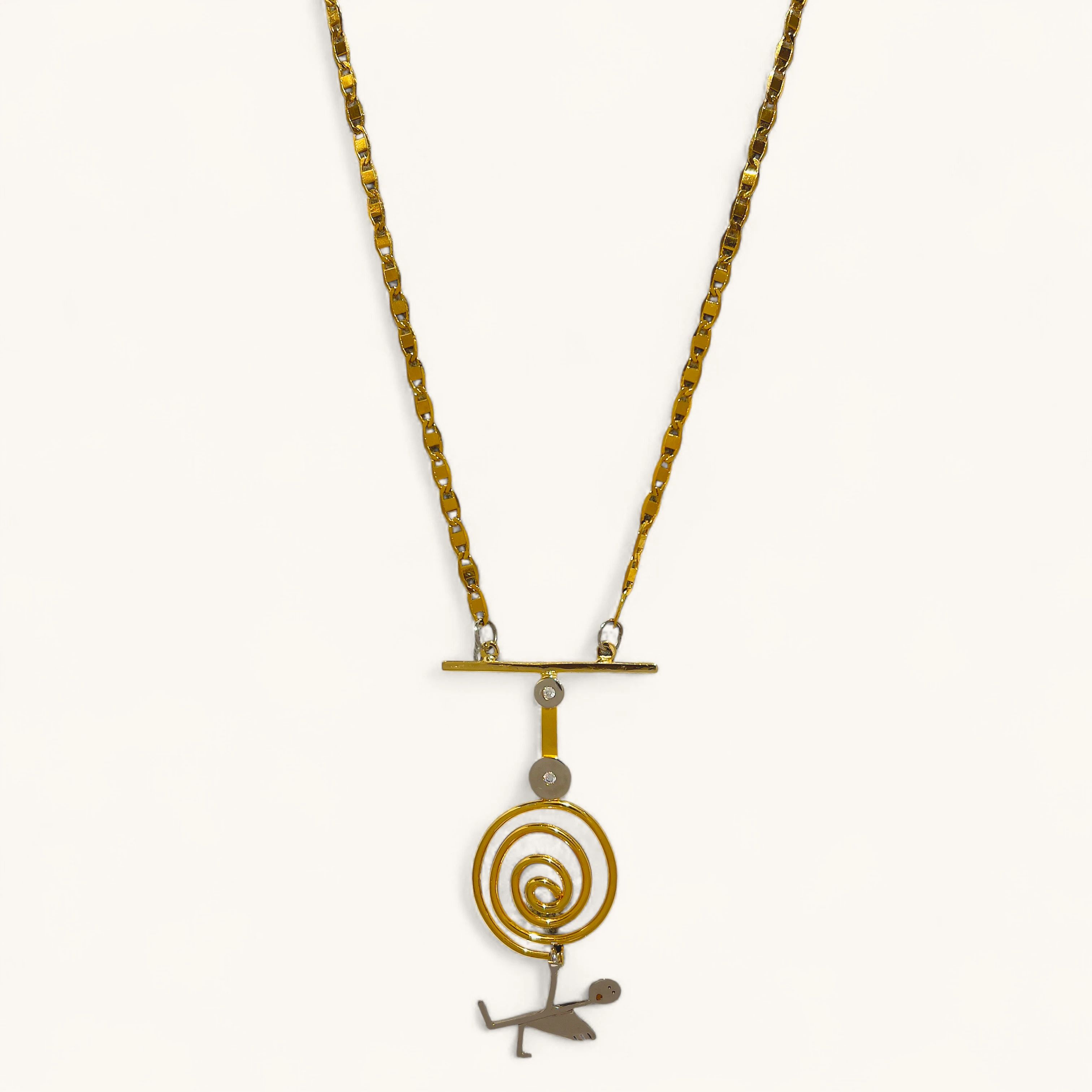 Kinetic pendant with concentric gold spirals and a whimsical stick-figure charm. Set on a reflective golden chain for gallery-chic style.