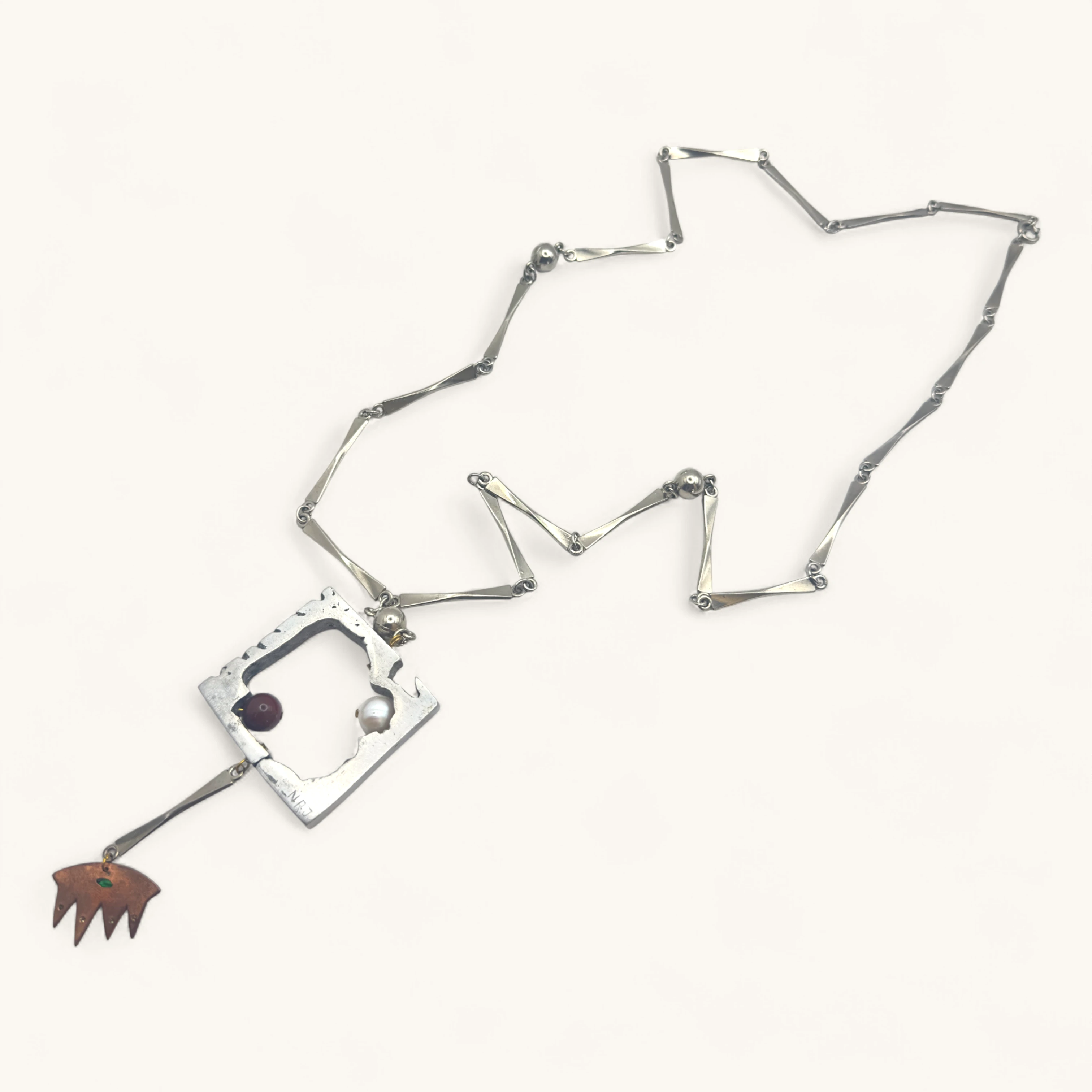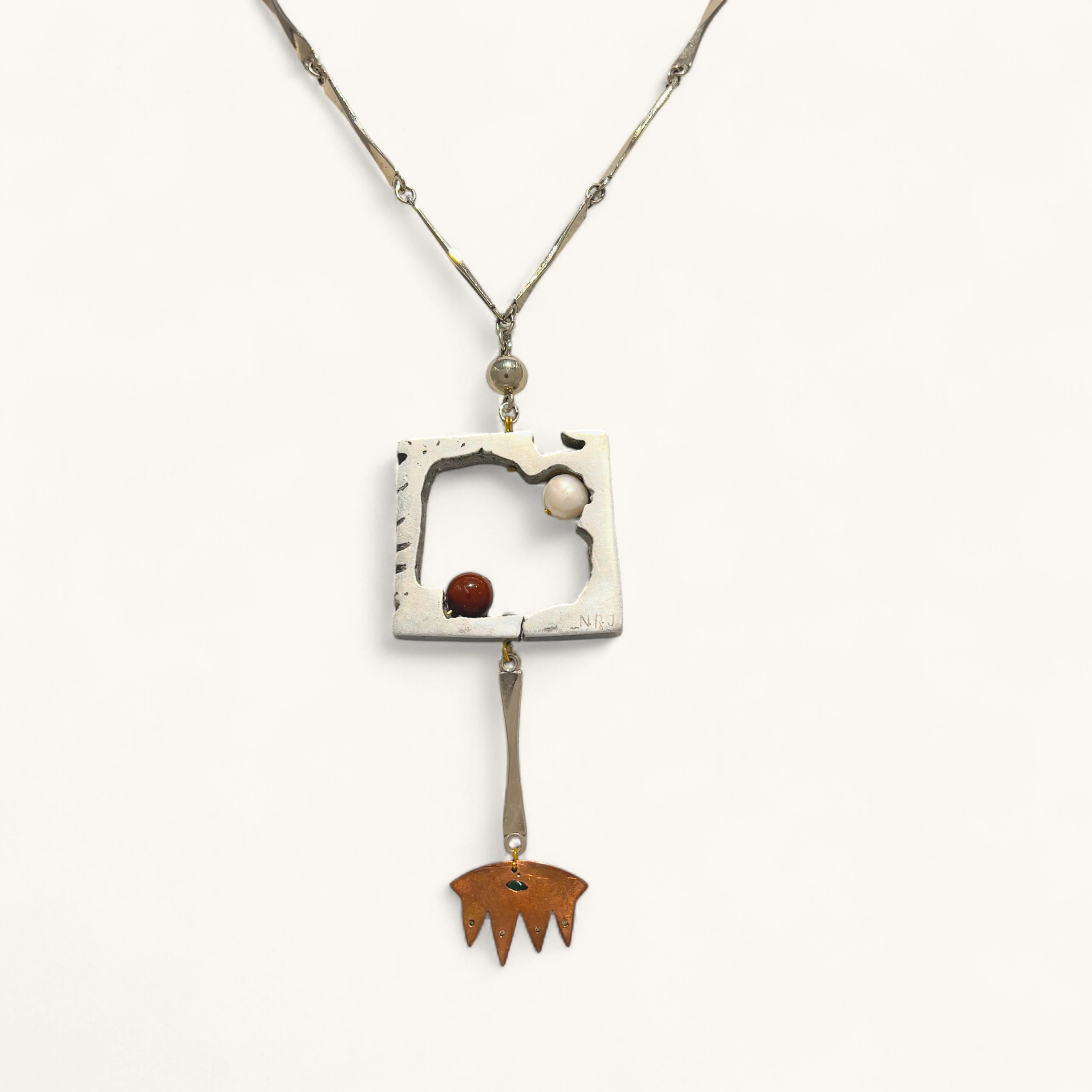 Square sculptural pendant with cutouts, two colorful bead insets, and a bronze drop charm. A statement art-jewelry piece.