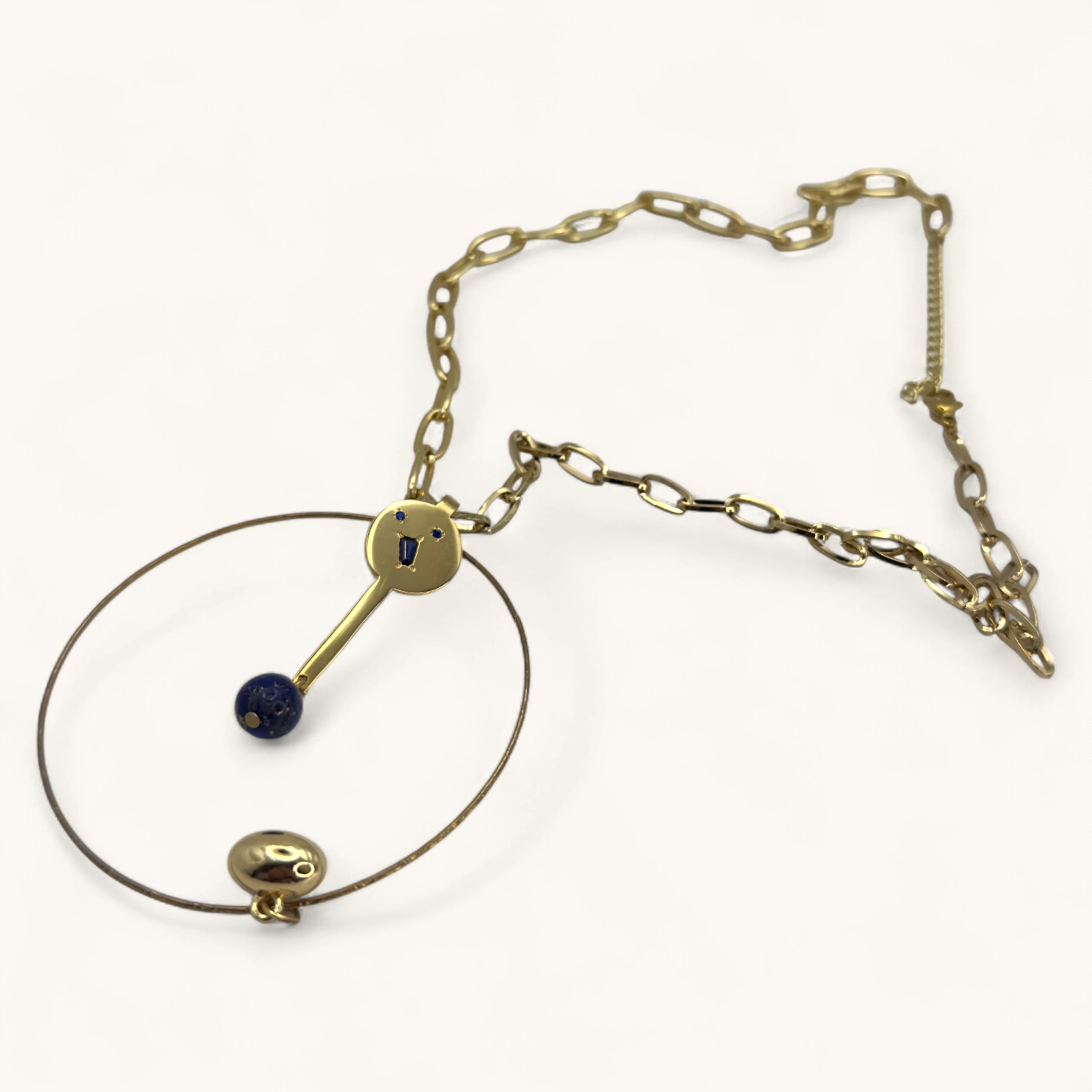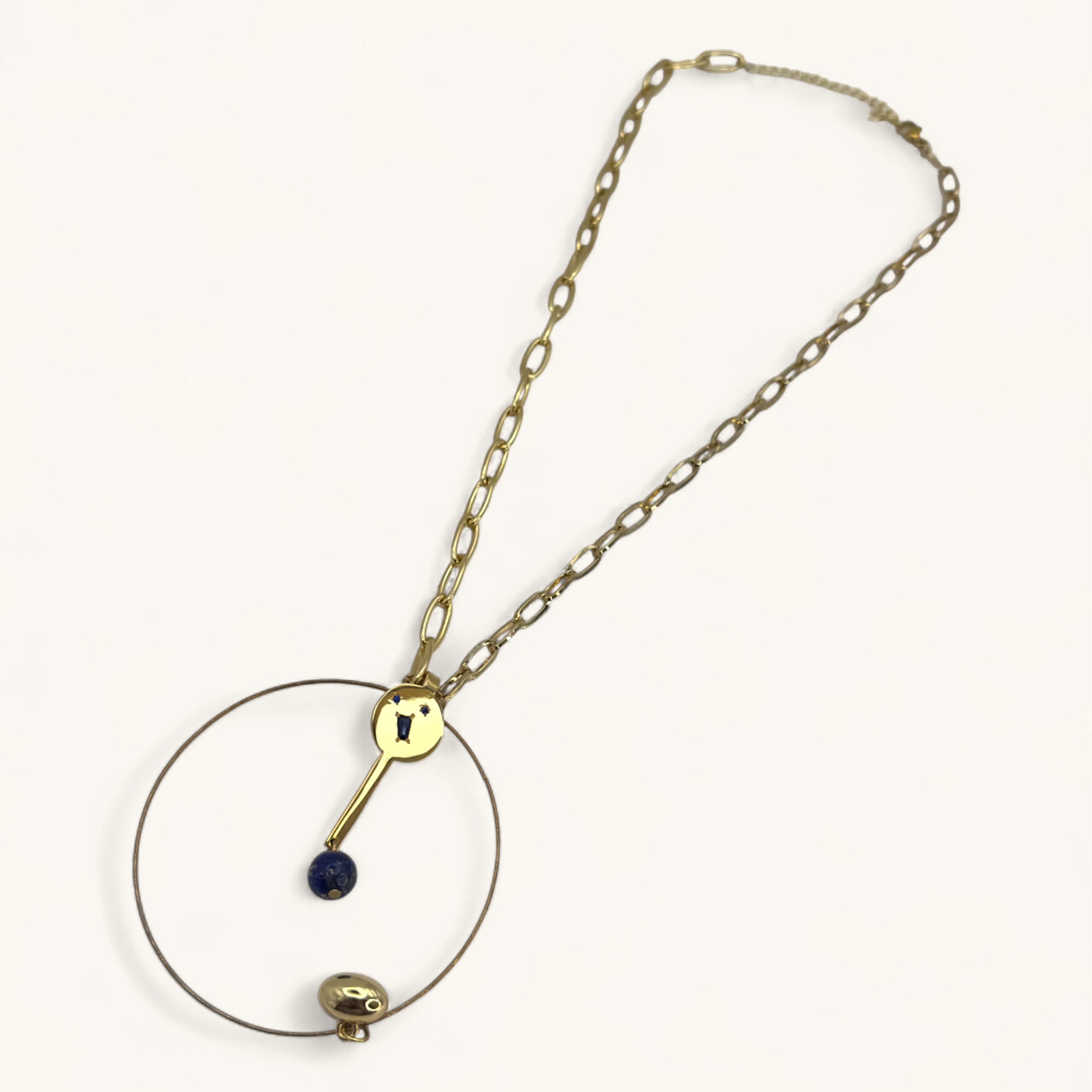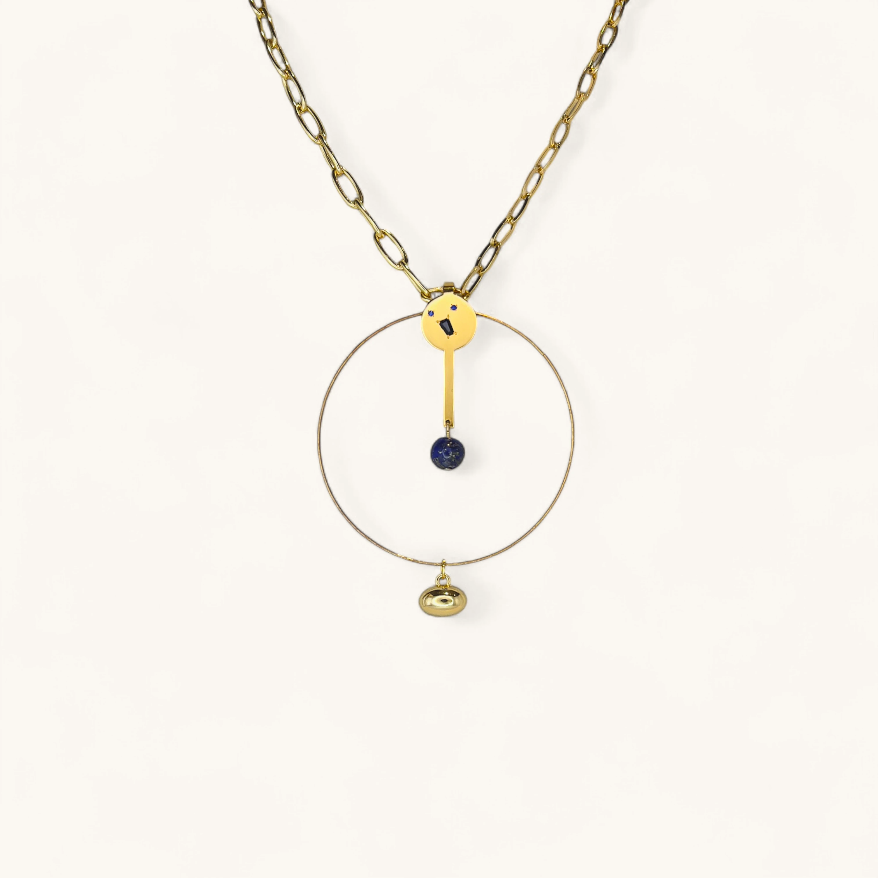 This avant-garde necklace features a bold, gold-toned chain with large, interlocking links. The pendant is a stunning and abstract design. At the top, a small, playful face with blue eyes is attached to a vertical bar, which holds a deep blue bead. This bar is suspended within a large, thin circular hoop, creating a sense of dynamic movement and balance. A small, bell-shaped charm hangs from the bottom of the hoop, completing the modern, sculptural look. This unique piece combines geometric shapes and whimsical elements, making it a true statement accessory.