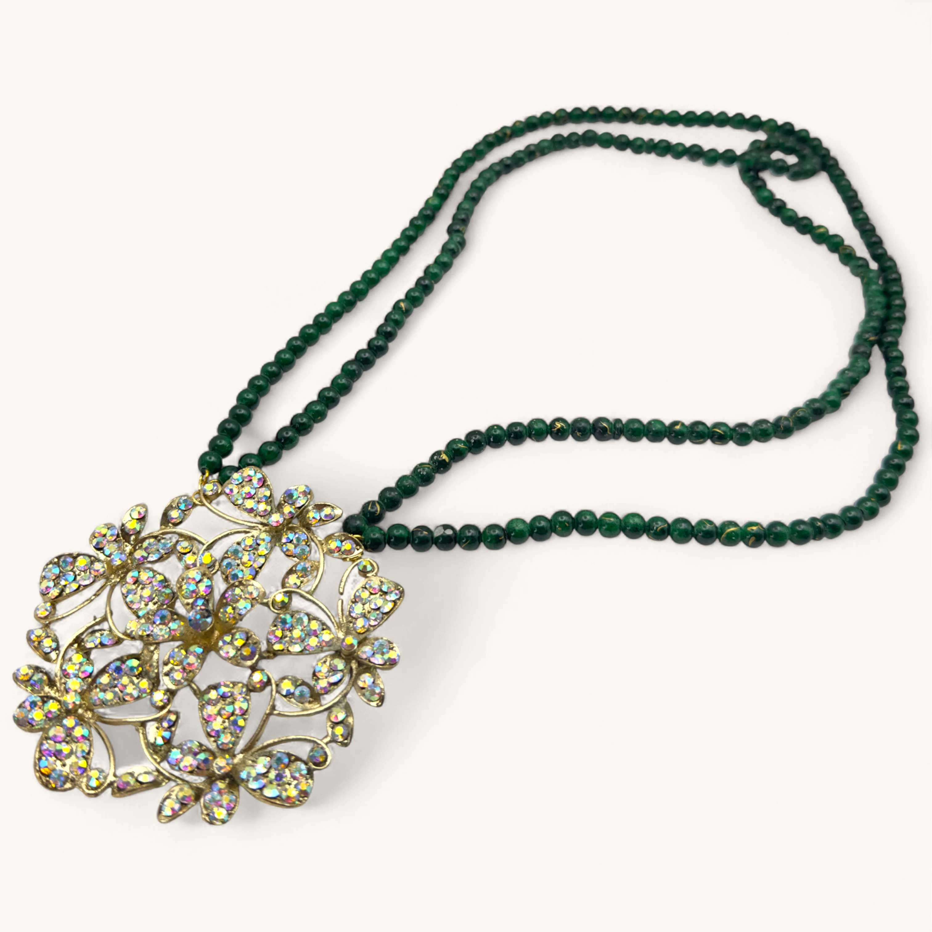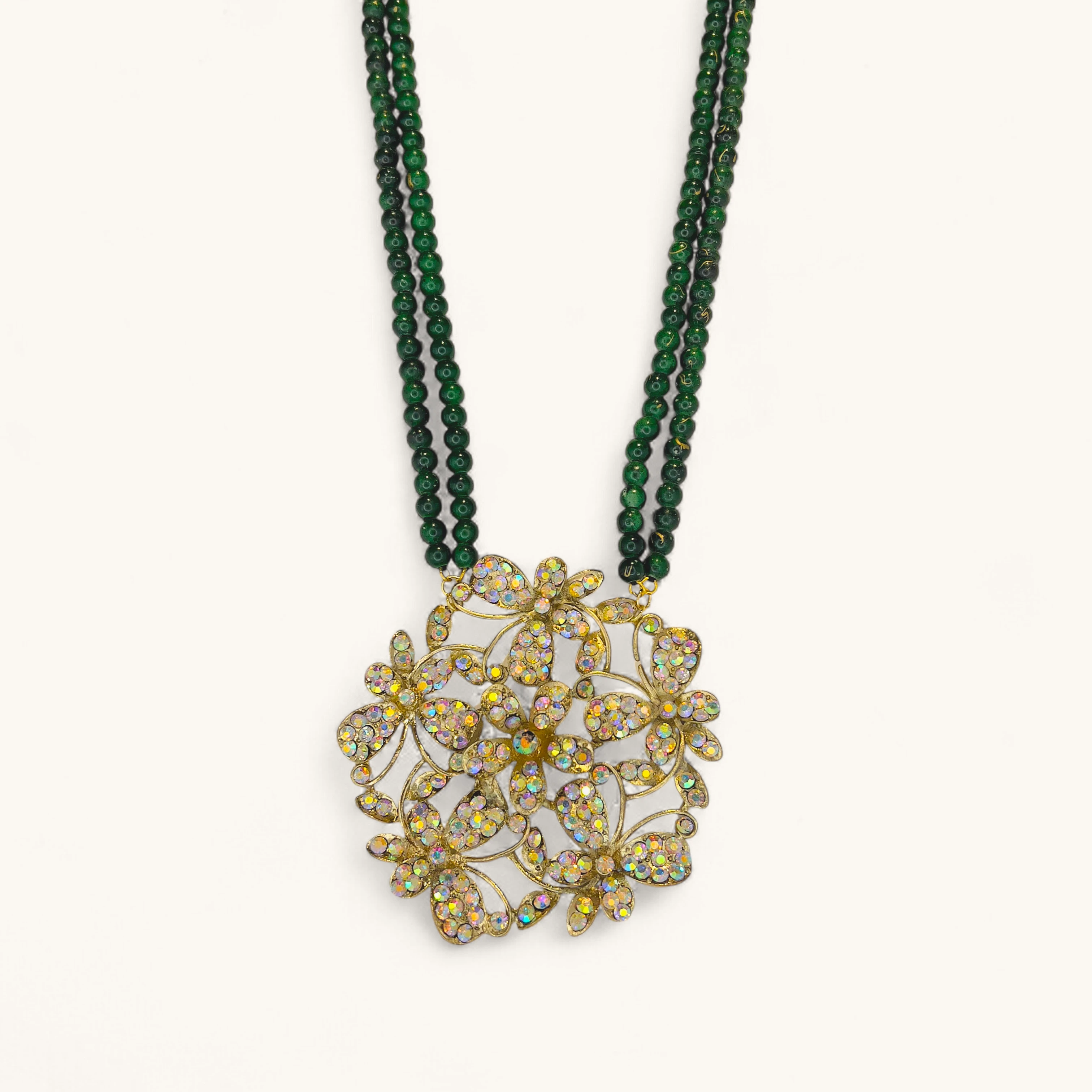This luxurious necklace features a double strand of polished, deep green beads, creating a rich and vibrant base. The centerpiece is a large, intricate medallion crafted from a gold-toned filigree in the shape of interconnected flowers and butterflies. The entire floral design is generously adorned with small, multifaceted iridescent stones that shimmer in shades of pink, yellow, and blue. This statement piece evokes a feeling of opulence and natural beauty, perfect for a special occasion.
