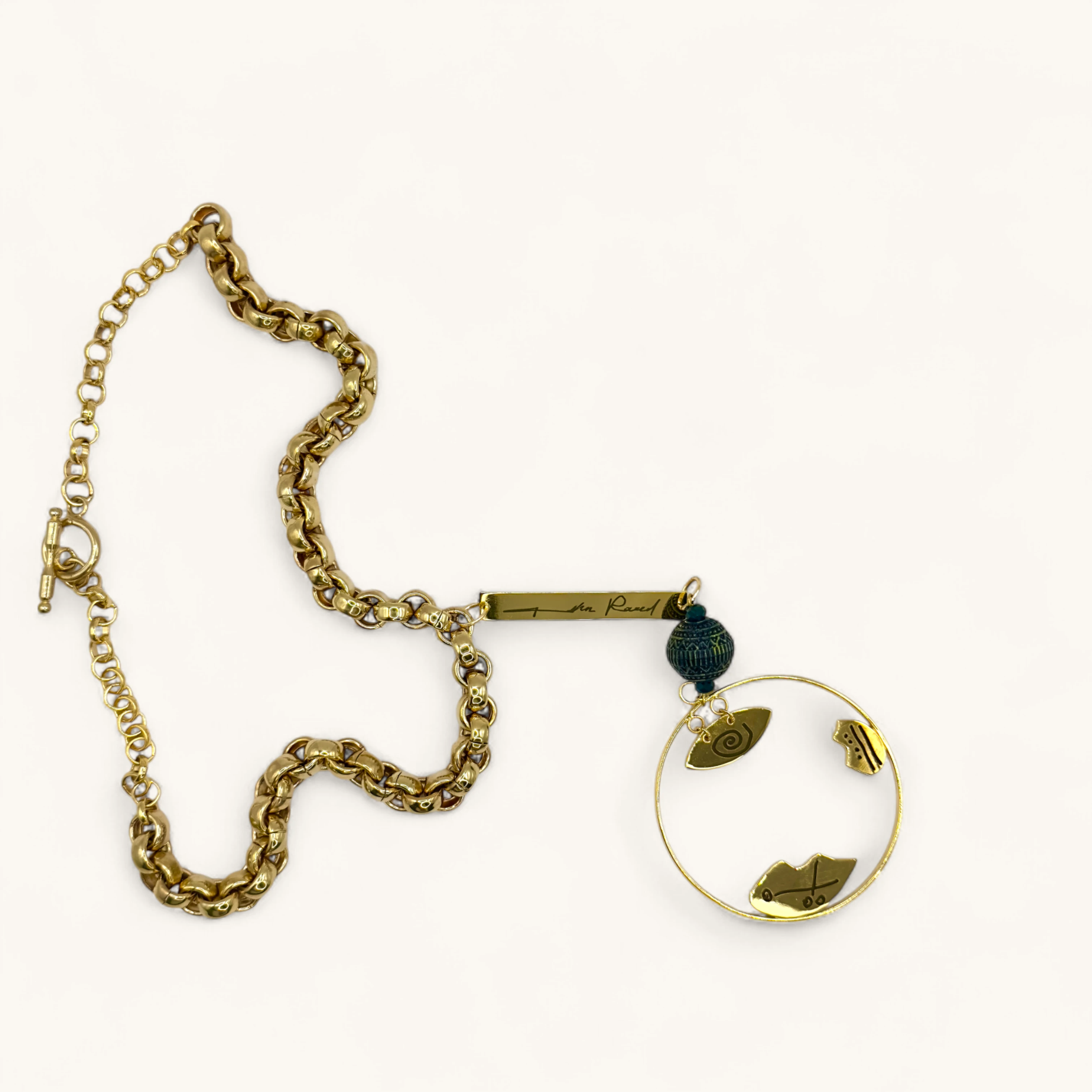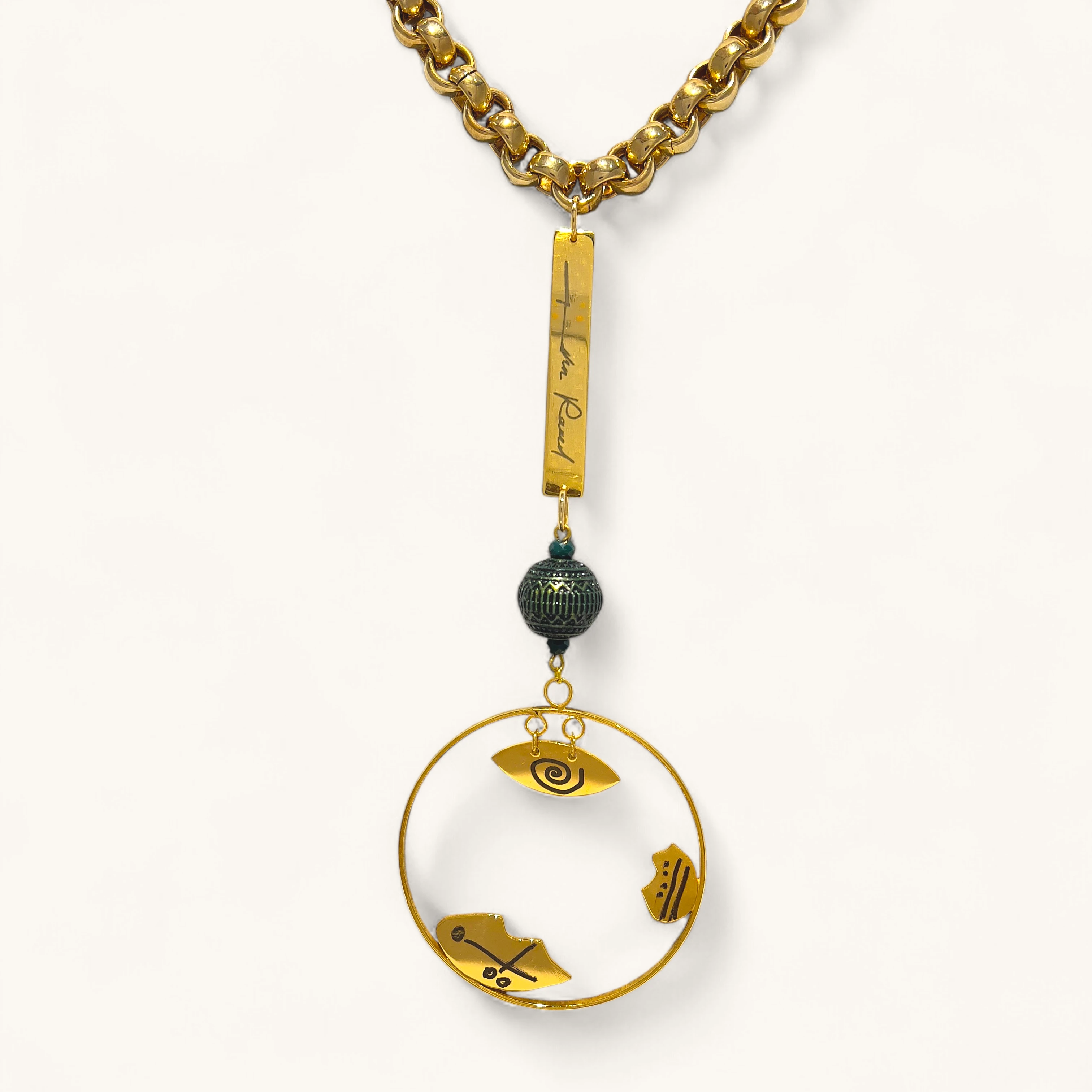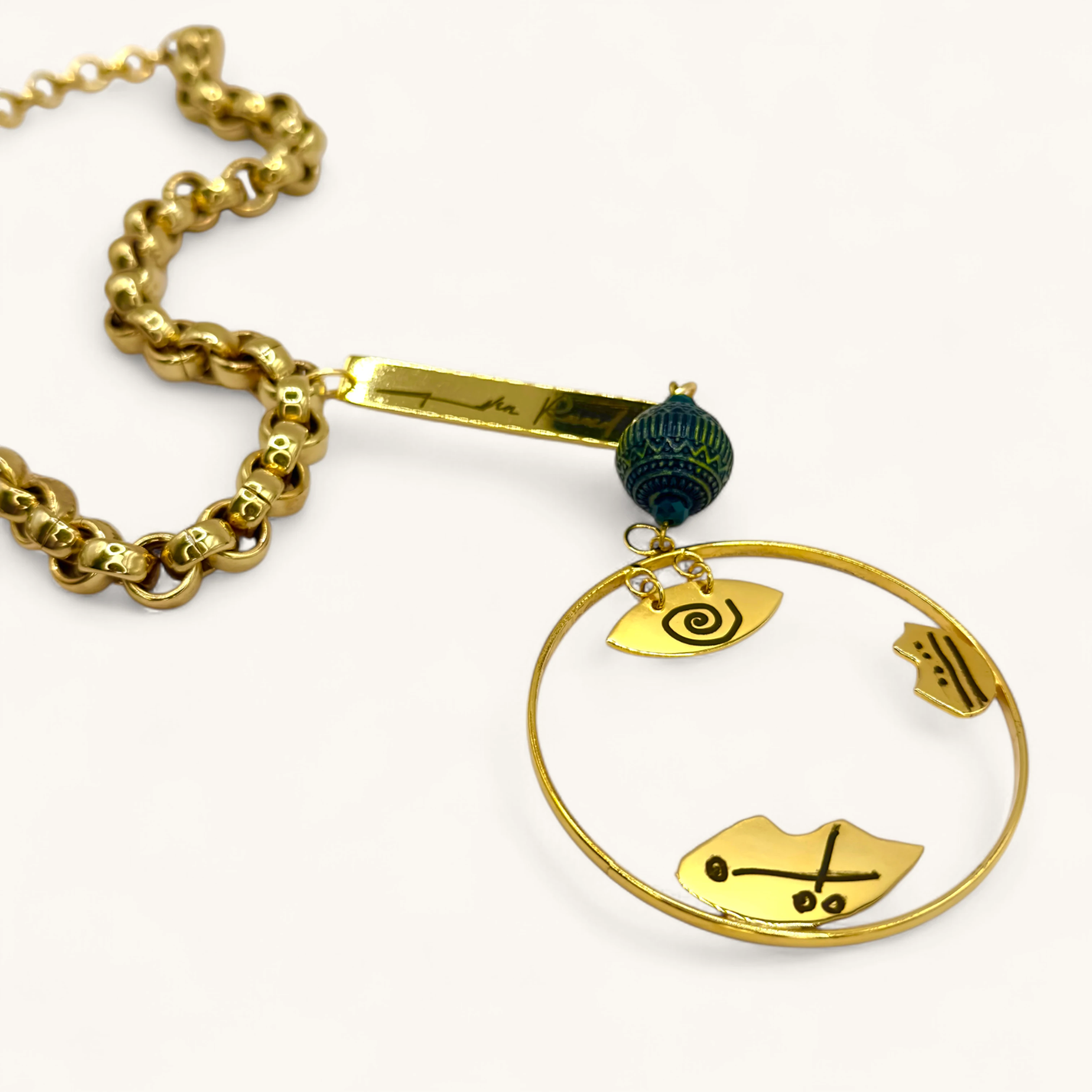 This striking and deeply artistic necklace features a bold, gold-toned chain with large, rounded links. The pendant is a complex and layered design with a story-like quality. At the top, a long, rectangular bar charm is engraved with a signature or inscription, adding a personalized touch. Below it, a single, textured bead in a deep shade of teal or green adds a pop of color and rich detail. The main part of the pendant is a large, open circular hoop with three smaller, irregularly shaped charms suspended within it. Each of these charms has unique, abstract etchings, suggesting symbols or figures. This piece is a true statement accessory, blending modern design with a handcrafted, ancient feel.