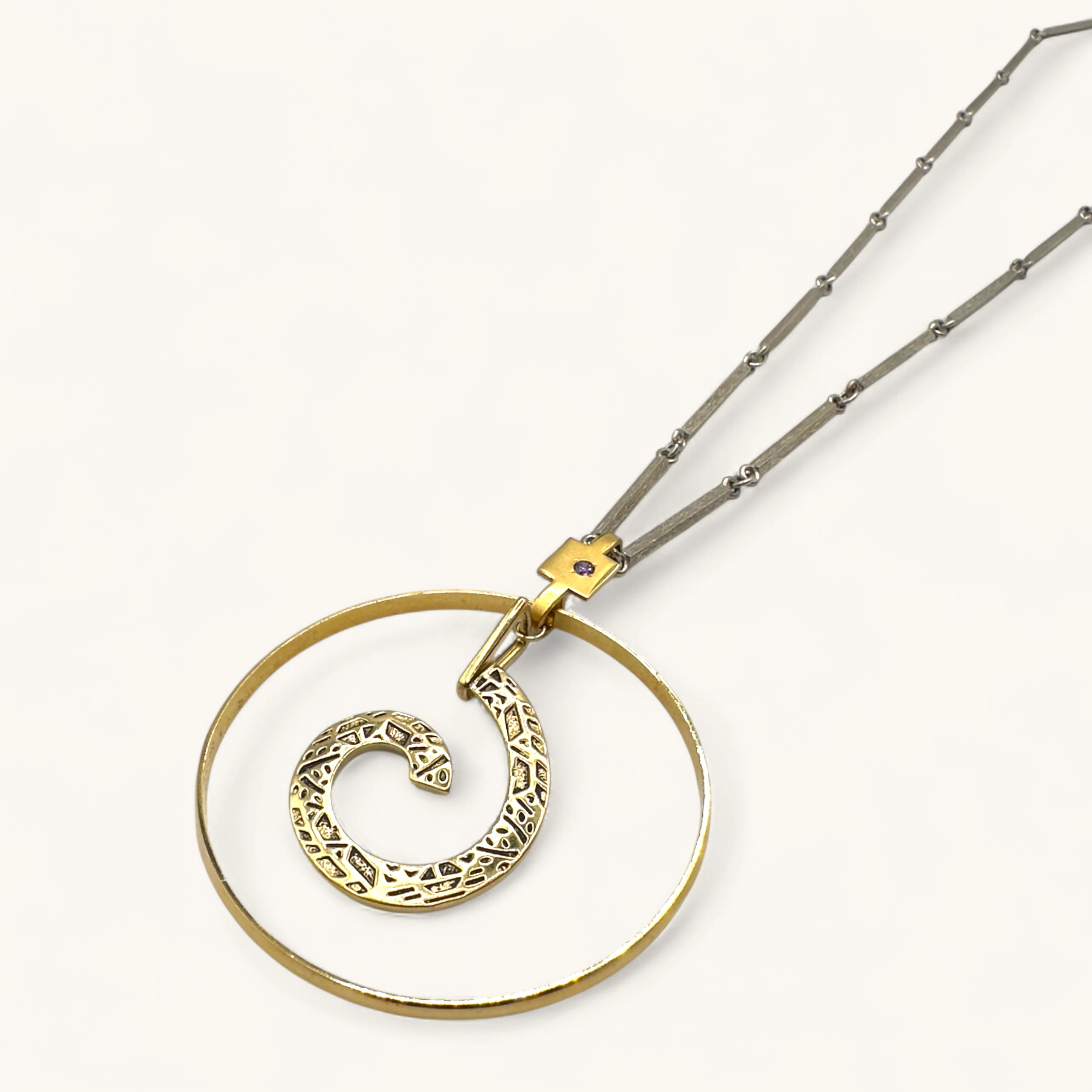 This striking and artistic necklace features a bold, multi-toned chain, blending silvery and gold-toned links. The pendant is a captivating piece of modern sculpture. It is composed of a large, thin, circular hoop that holds a second, intricately detailed, open-work spiral at its center. The spiral has an antique, filigree-like texture and a prominent, gold-toned finish. The pendant is attached to the chain by a small, squared charm with a vibrant purple stone, adding a pop of color to the otherwise monochromatic design. This necklace is a perfect blend of minimalist form and intricate detail.