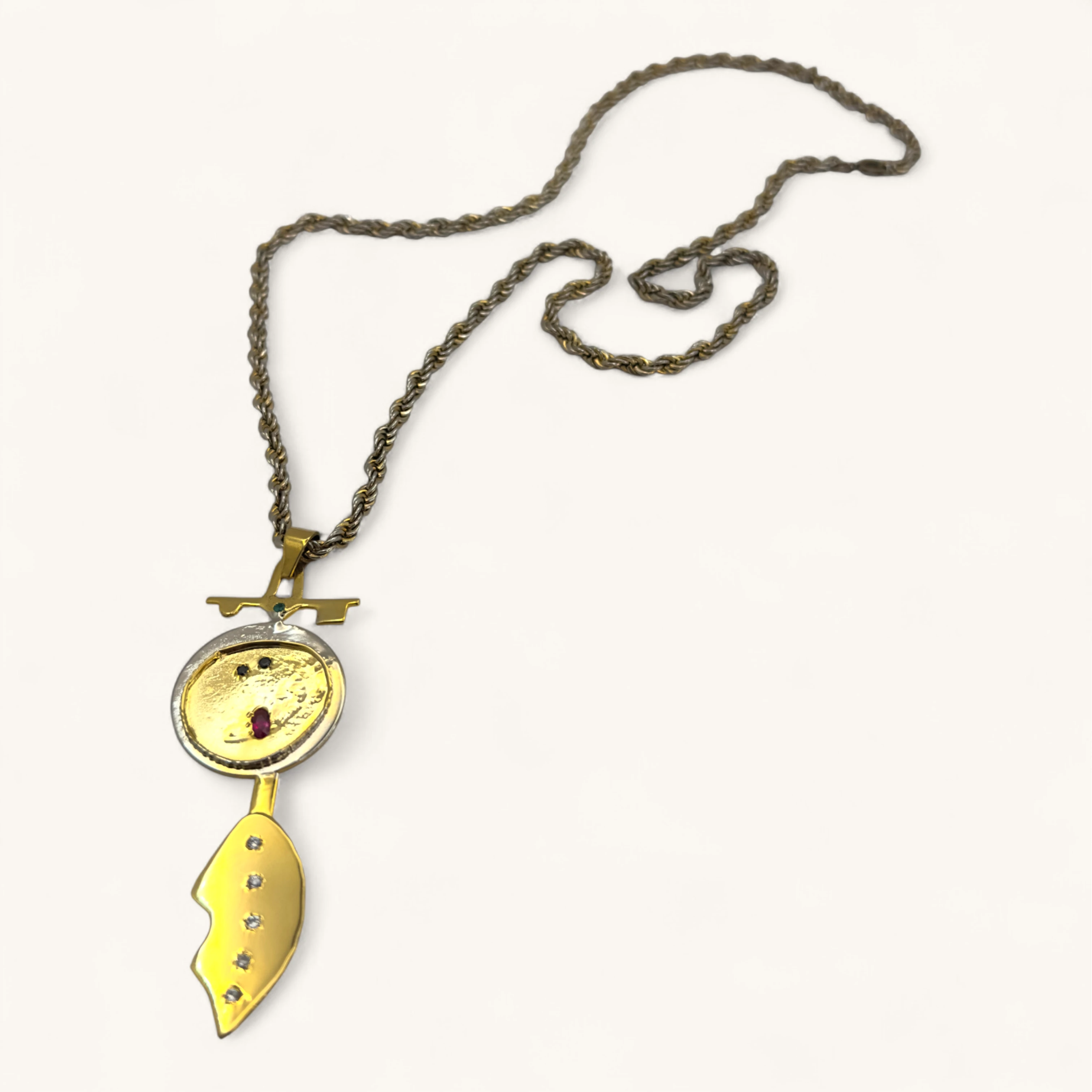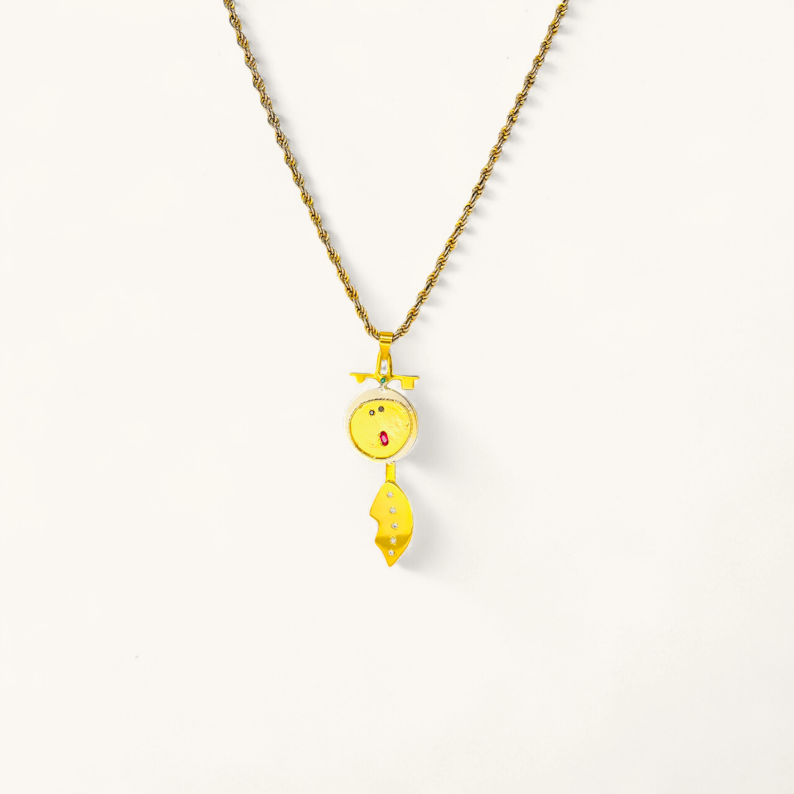 This unique necklace features a gold-toned, abstract pendant hanging from a classic twisted rope chain. The pendant is composed of two main elements. The top piece is a circular charm with a charmingly abstract, cartoon-like face with a pink mouth and what appears to be a stylized eye. Below it, a large, asymmetrical leaf or wing-shaped charm with small embedded stones dangles, adding a touch of sparkle and nature-inspired elegance. The playful, artistic feel of the design makes this a statement piece that is both whimsical and modern.