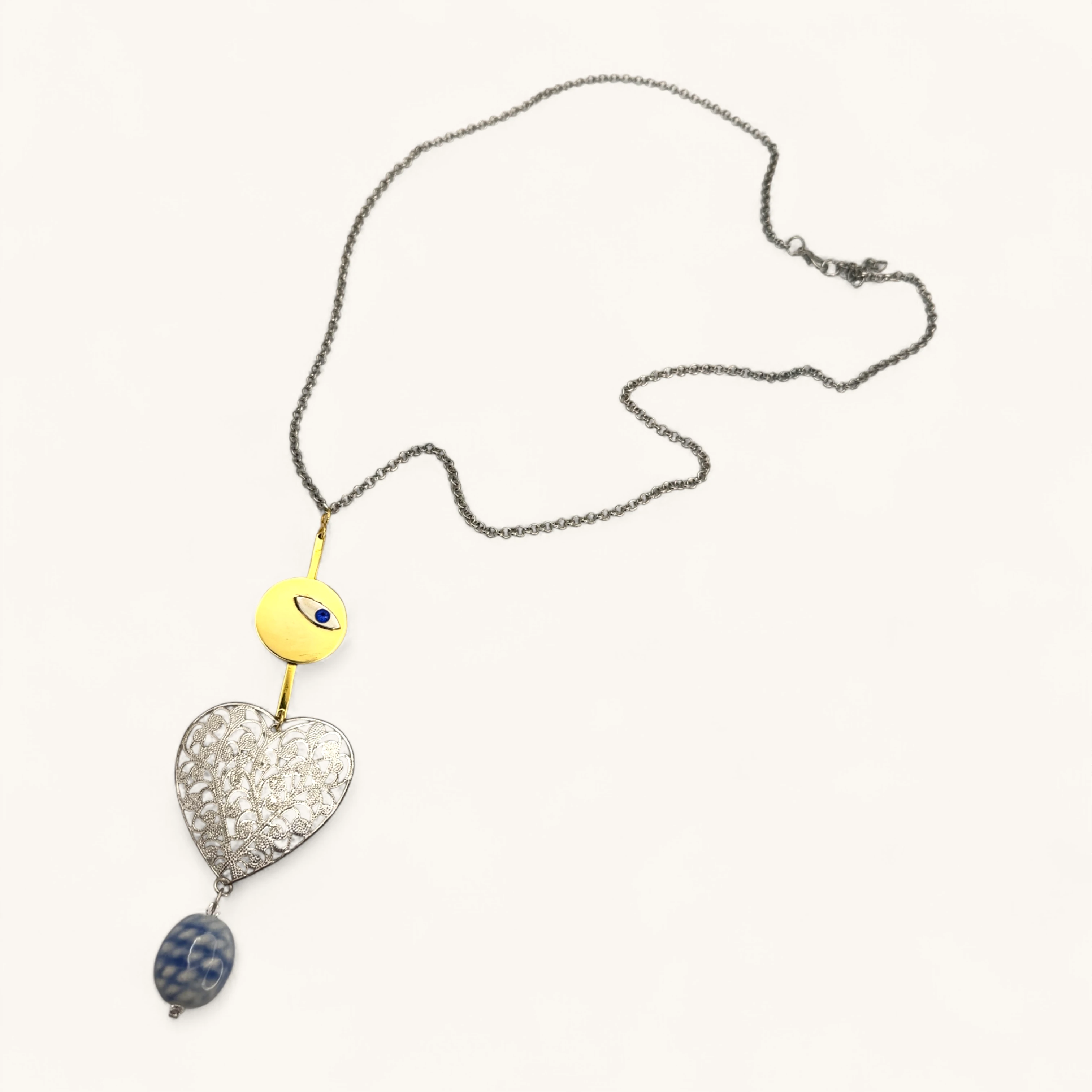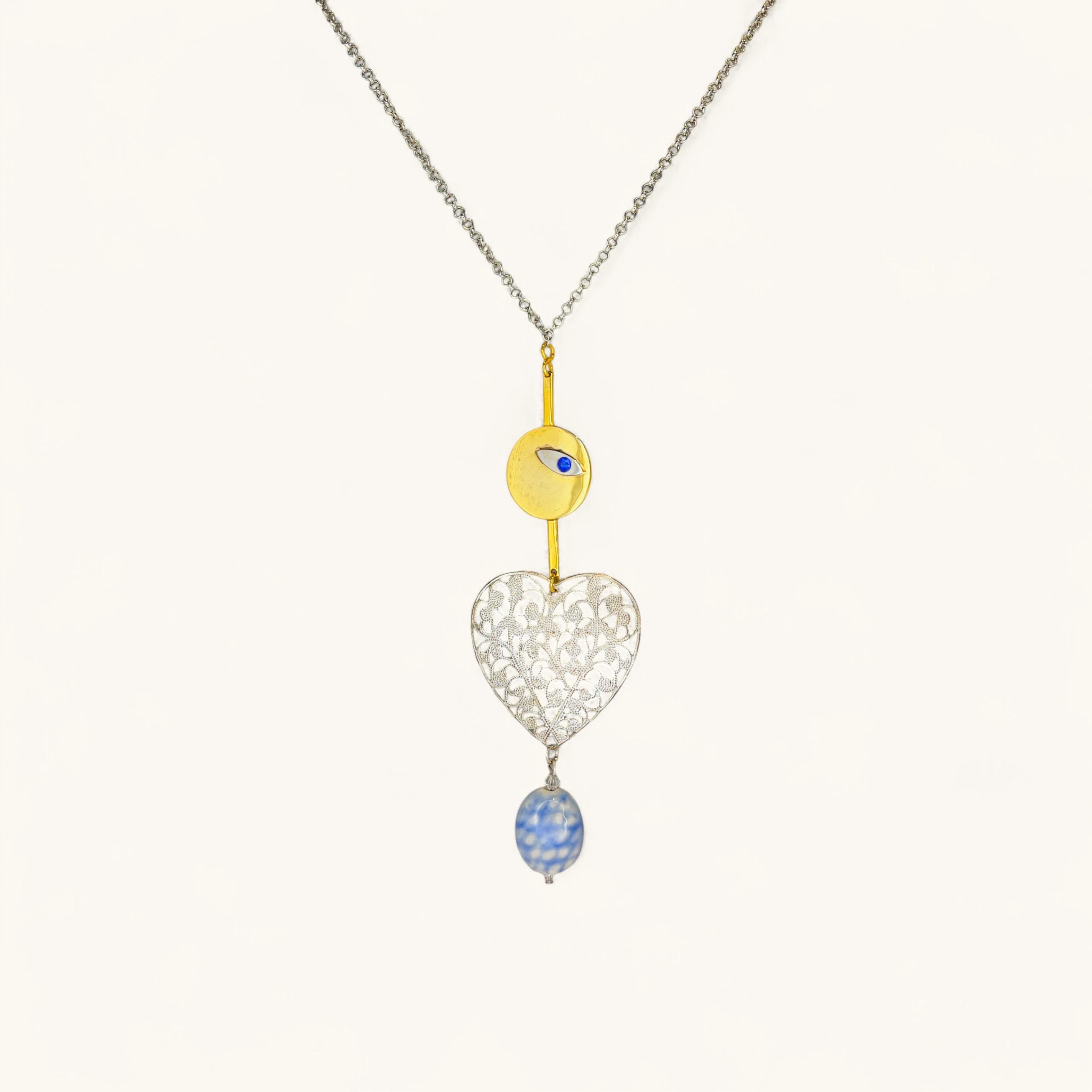 This captivating necklace features a multi-tiered pendant that combines different textures and symbols. At the top, a gold-toned disc is adorned with a striking blue evil eye, a symbol of protection. Below this, a beautifully crafted, silvery heart with a delicate filigree pattern adds a romantic and intricate touch. The pendant is finished with a marbled, blue and white glass bead, creating a stunning and unique cascade. The entire piece hangs from a simple, silver-toned chain, balancing the ornate pendant with a clean, classic feel.