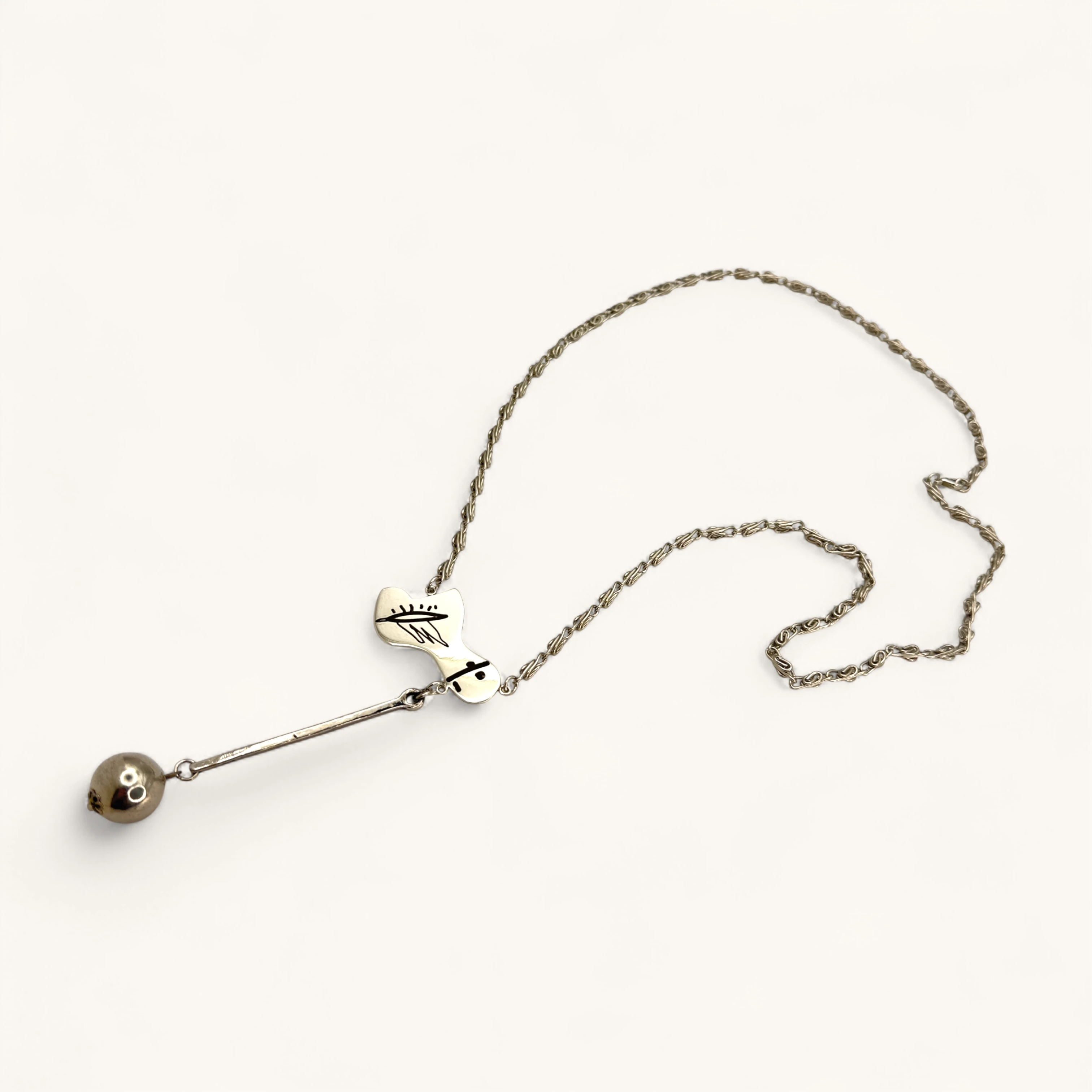 This striking necklace features a unique, stylized aircraft pendant, crafted from a lustrous, silvery metal. The pendant’s sleek design is accented with a delicate, etched detail resembling a mountain peak or a wing. Dangling from the pendant is a fine chain that leads to a perfect, dark pearl, creating an elegant drop. The chain of the necklace itself is a twisted rope design, adding a classic texture that complements the modern feel of the pendant. This piece evokes a sense of journey and exploration, balancing a minimalist aesthetic with a touch of organic elegance.