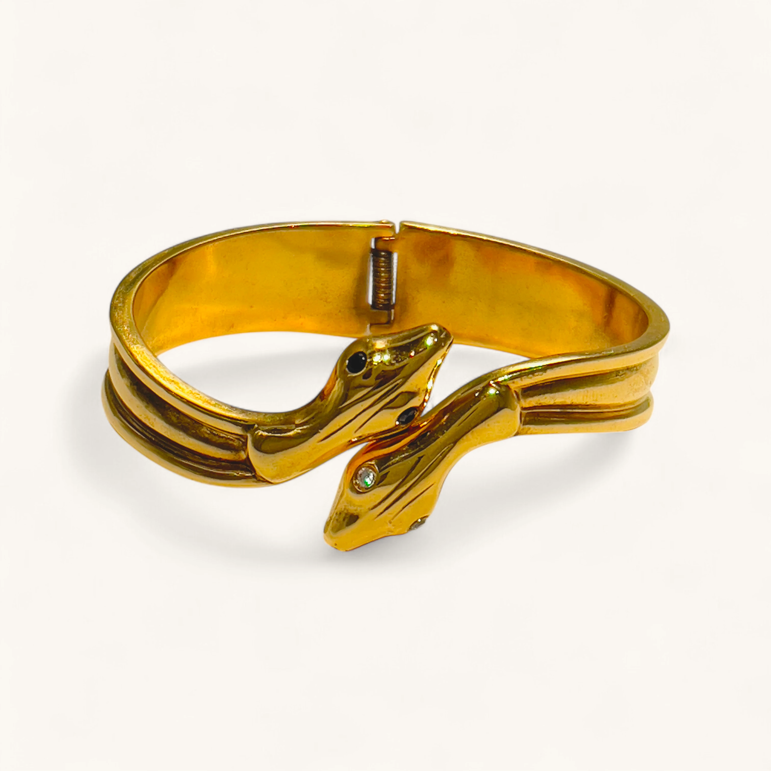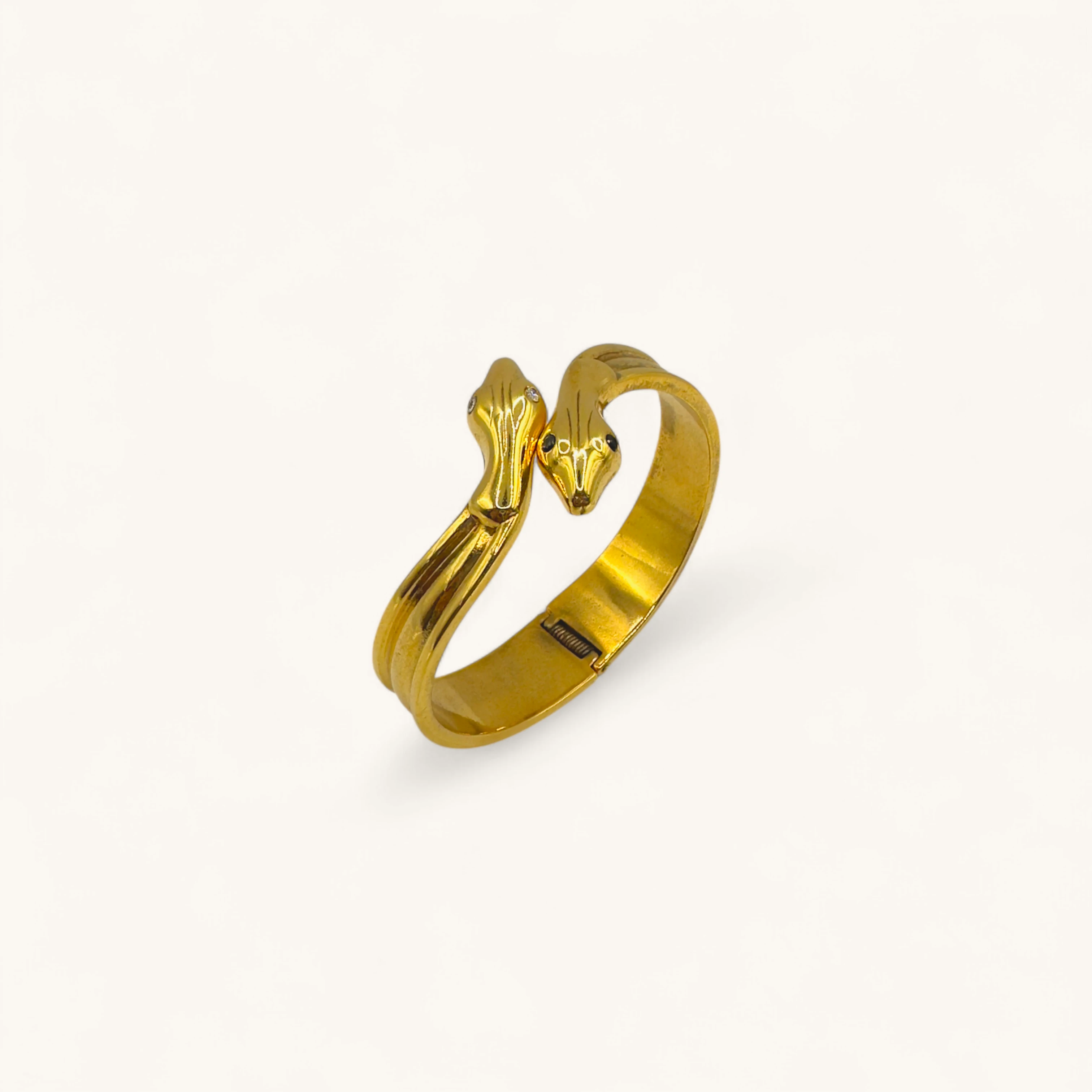 This bold hinged bracelet showcases two intertwined snake heads, symbolizing power and transformation. Crafted in a polished gold-tone finish, the snakes feature detailed engravings and sparkling stone accents in their eyes for a striking look. A statement piece that blends ancient symbolism with modern style, perfect for those who love jewelry with meaning and edge.