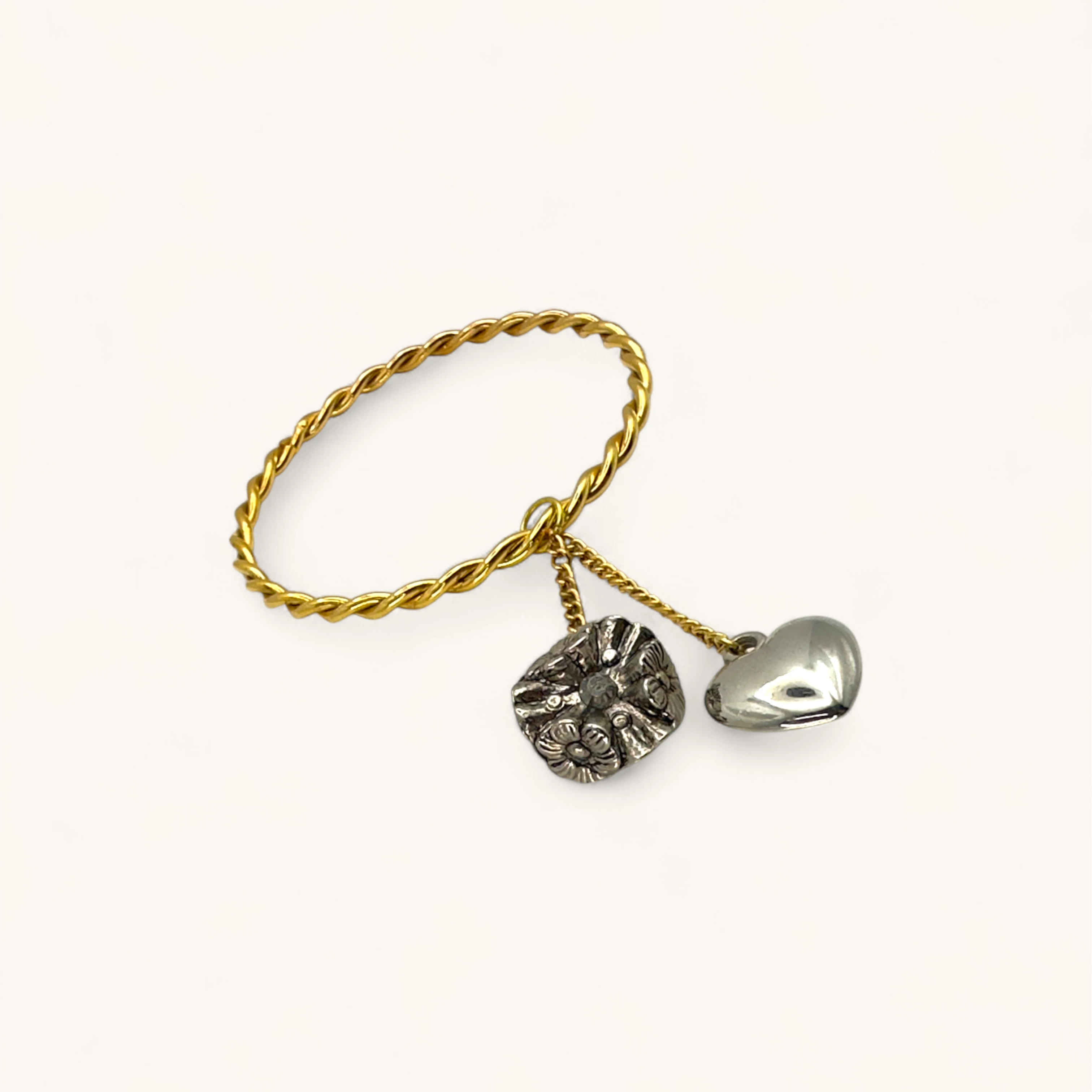A beautifully twisted gold bangle adorned with two silver-tone charms: a cluster of detailed flowers and a smooth heart pendant. The combination of textures and tones gives this bracelet a romantic yet artisanal appeal. Perfect as a meaningful gift or a versatile everyday accessory with a touch of elegance.